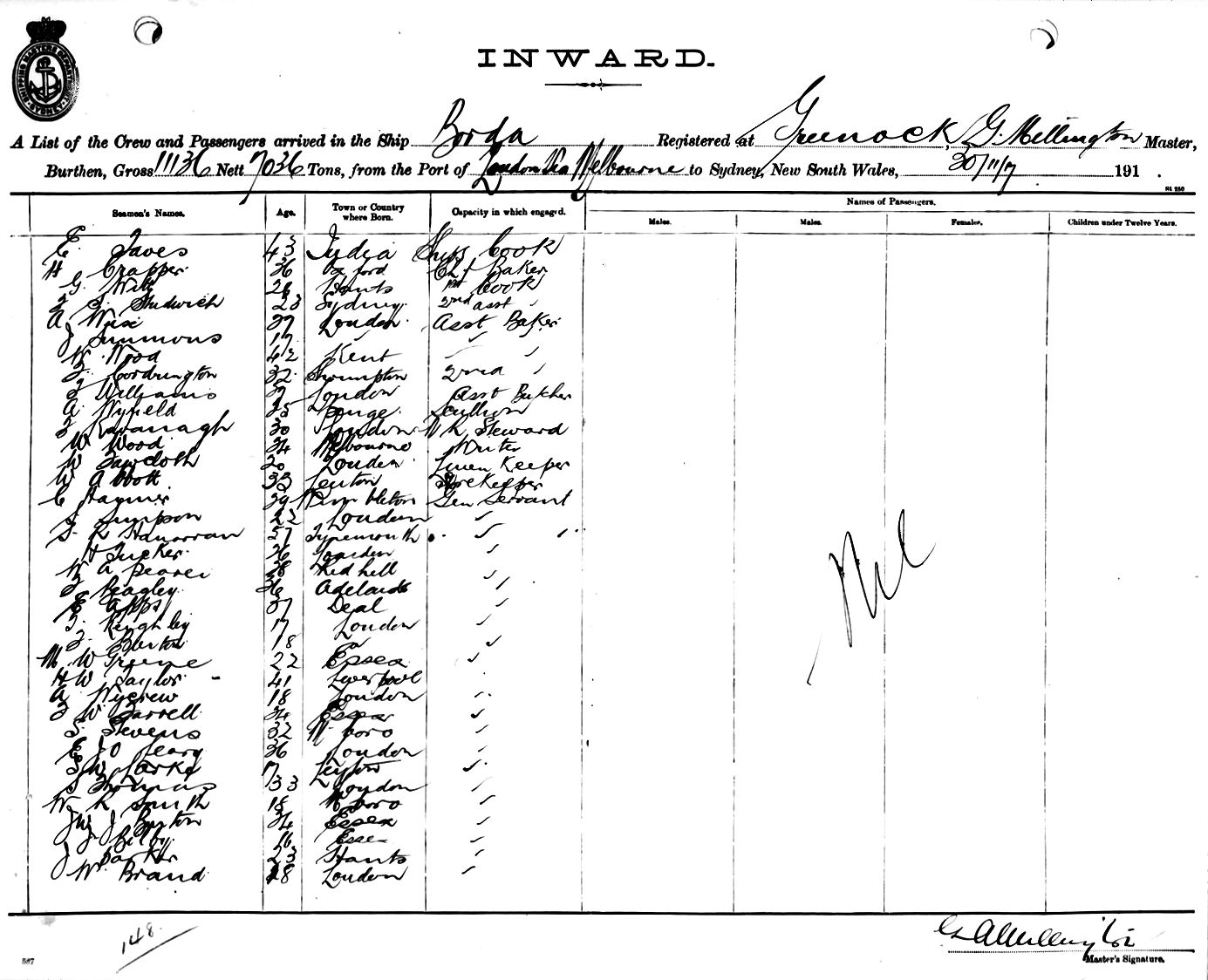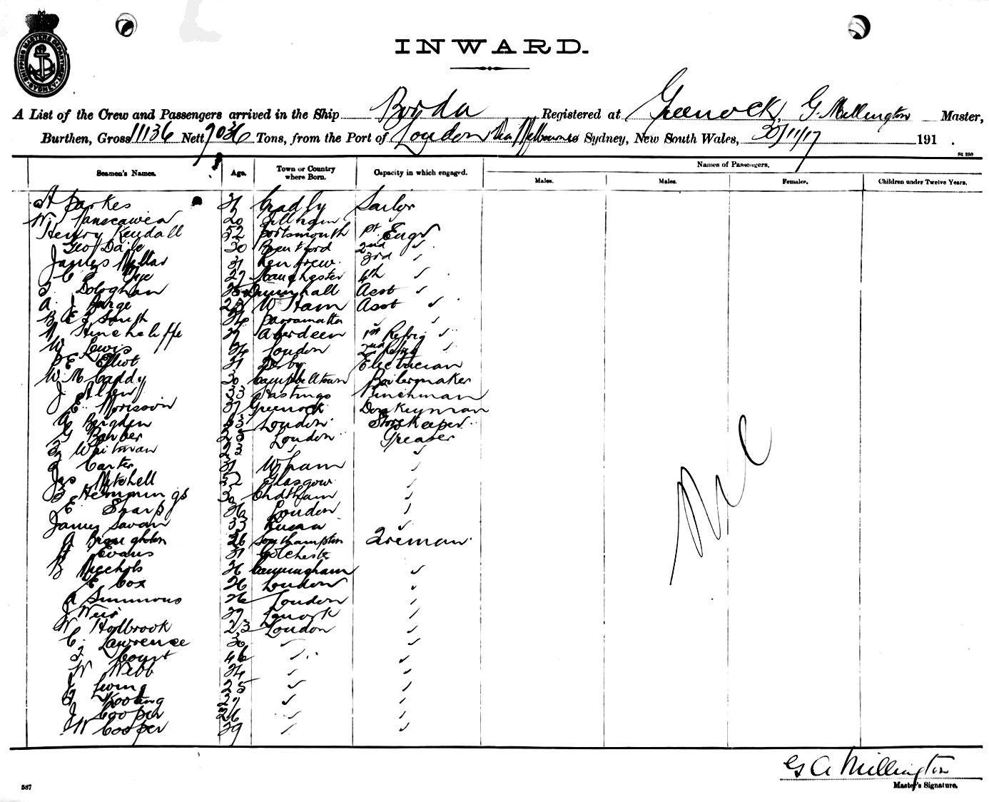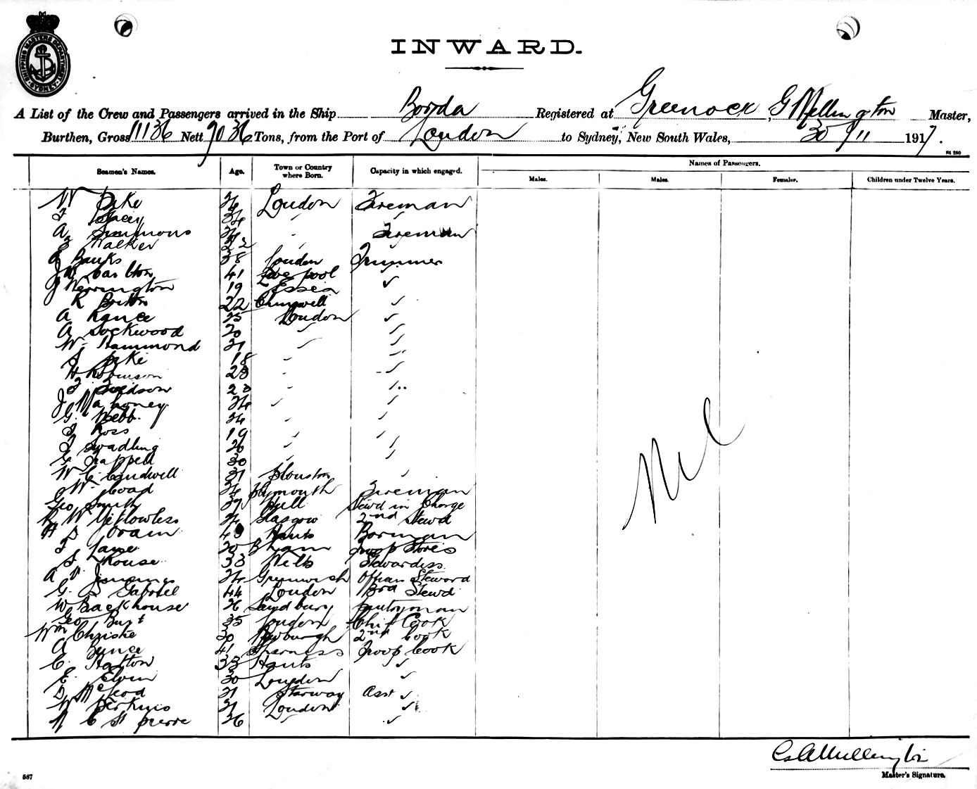 Mariners and ships in Australian Waters |  BORDAOF GREEOCK, G. MILLINGTON, MASTER, BURTHEN 11136/9036 TONS FROM THE PORT OF LONDON via MELBOURNE TO SYDNEY, NEW SOUTH WALES, 30TH NOVEMBER 1917 |