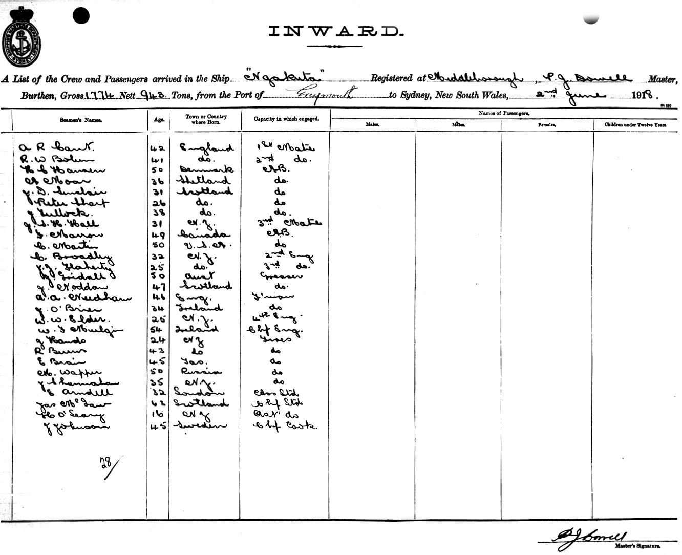 NGAKUTAOF MIDDLEBOROUGH, P.J DOWELL, MASTER, BURTHEN 1774/943 TONS FROM THE PORT OF GREYMOUTH TO SYDNEY, NEW SOUTH WALES, 2ND JUNE 1918 |