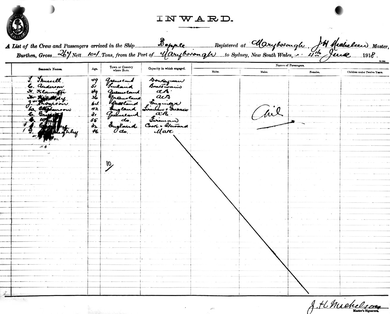 BOPPLEOF MARYBOROUGH, J.H. MICHELSON, MASTER, BURTHEN 267/104 TONS FROM THE PORT OF MARYBOROUGH TO SYDNEY, NEW SOUTH WALES, 4TH JUNE 1918 |