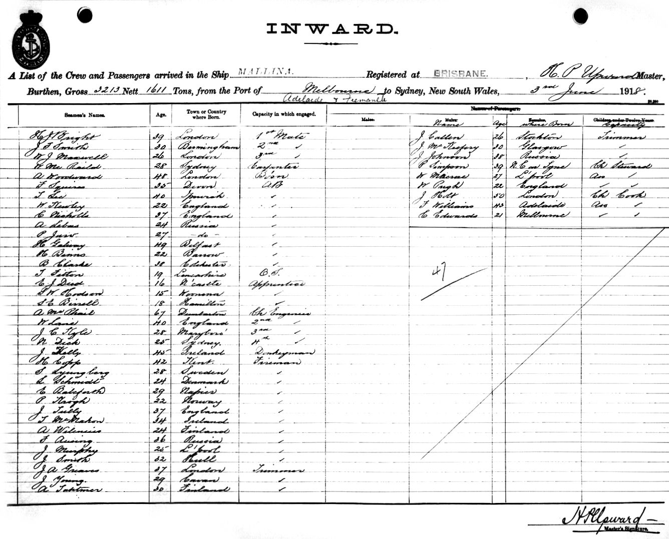 MALLINAOF BRISBANE, H.P. UPWARD, MASTER, BURTHEN 3213/1611 TONS FROM THE PORTS OF MELBOURNE, ADELAIDE & FREMANTLE TO SYDNEY, NEW SOUTH WALES, 3RD JUNE 1918 |