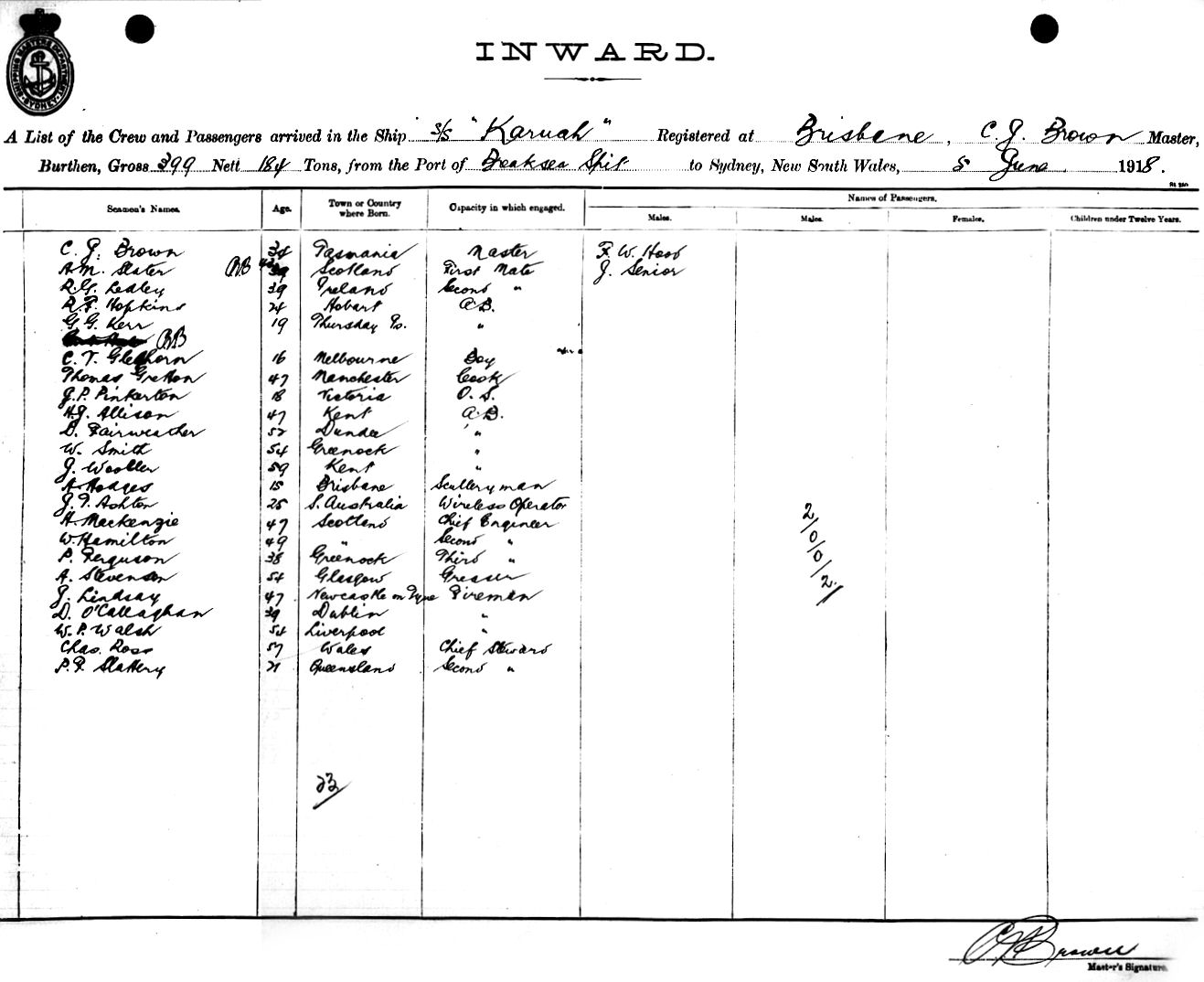 KARUAHOF BRISBANE, C.J. BROWN, MASTER, BURTHEN 399/184 TONS FROM BREAKSEA SPIT (FRASER ISLAND) TO SYDNEY, NEW SOUTH WALES, 5TH JUNE 1918 |