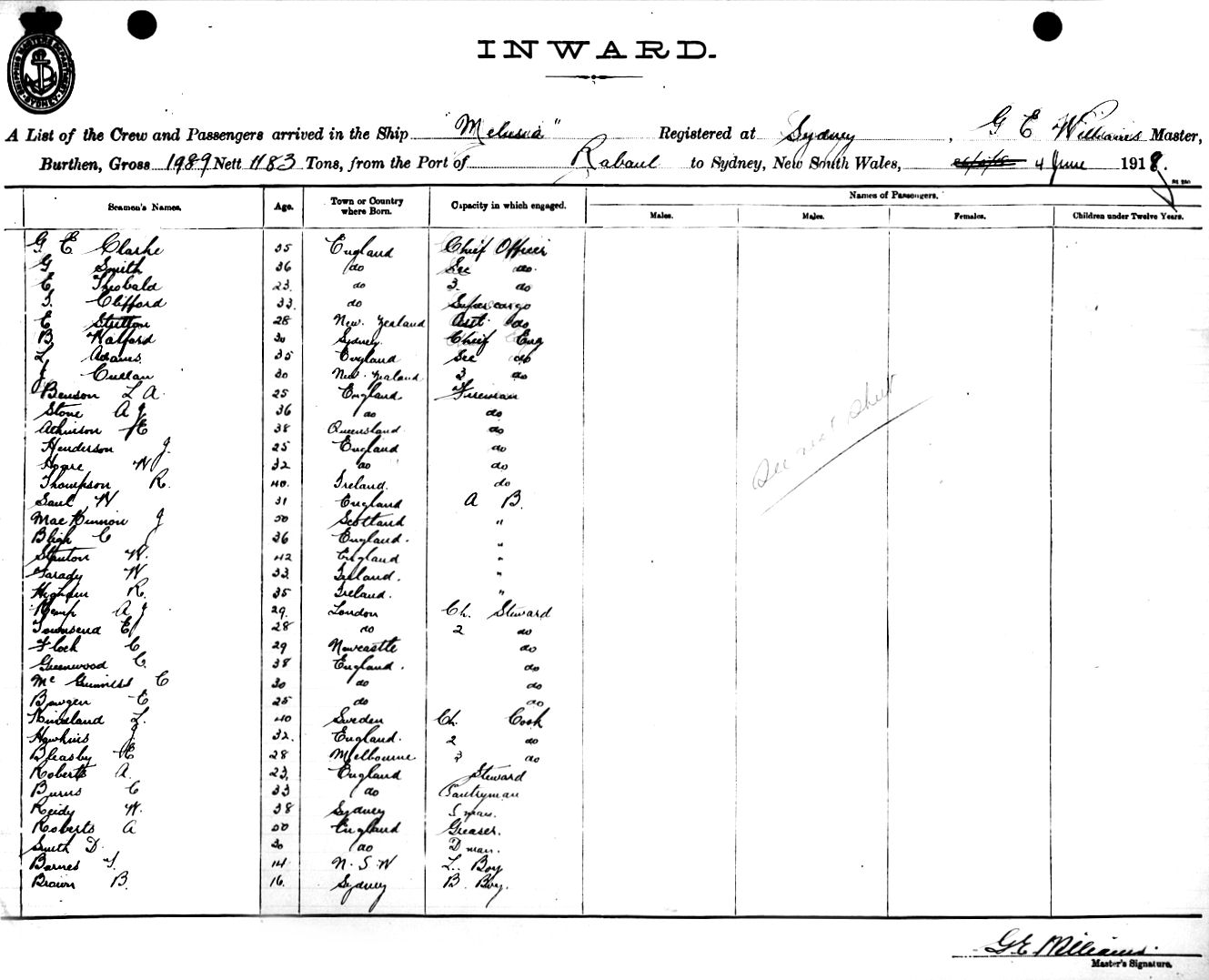 MELUSIAOF SYDNEY, G.E. WILLIAMS, MASTER, BURTHEN 1989/1183 TONS FROM THE PORT OF RABAUL TO SYDNEY, NEW SOUTH WALES, 4TH JUNE 1918 |