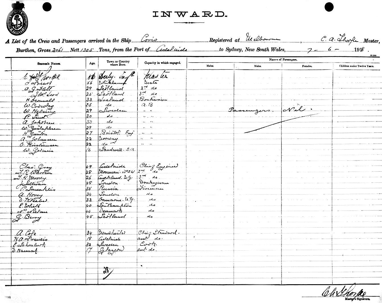 CORIOOF MELBOURNE, C.A. THORPE, MASTER, BURTHEN 2061/1305 TONS FROM THE PORT OF ADELAIDE TO SYDNEY, NEW SOUTH WALES, 7TH JUNE 1918 |
