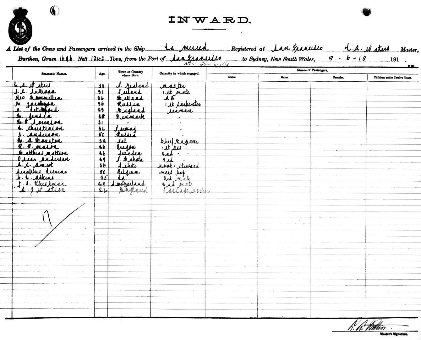 LA MERCEDOF SAN FRANCISCO, L.A. WATERS, MASTER, BURTHEN 1696/1342 TONS FROM THE PORT OF SAN FRANCISCO VIA TOWNSVILLE TO SYDNEY, NEW SOUTH WALES, 8TH JUNE 1918 |