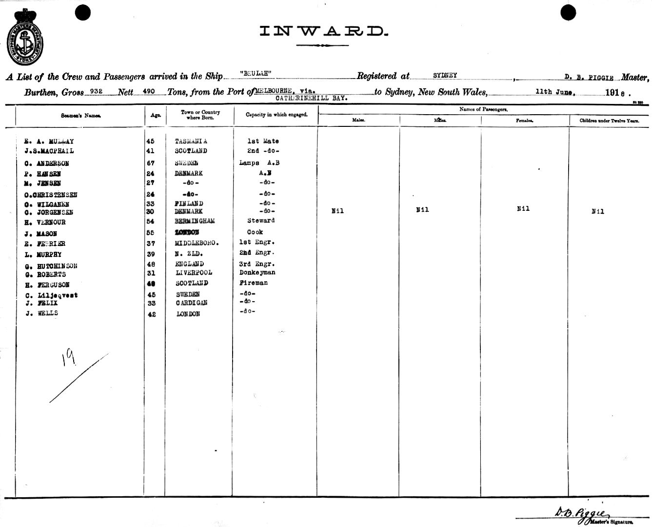 BEULAHOF SYDNEY, D.B. PIGGIE, MASTER, BURTHEN 932/490 TONS FROM THE PORT OF MELBOURNE VIA CATHERINE HILL BAY TO SYDNEY, NEW SOUTH WALES, 11TH JUNE 1918 |