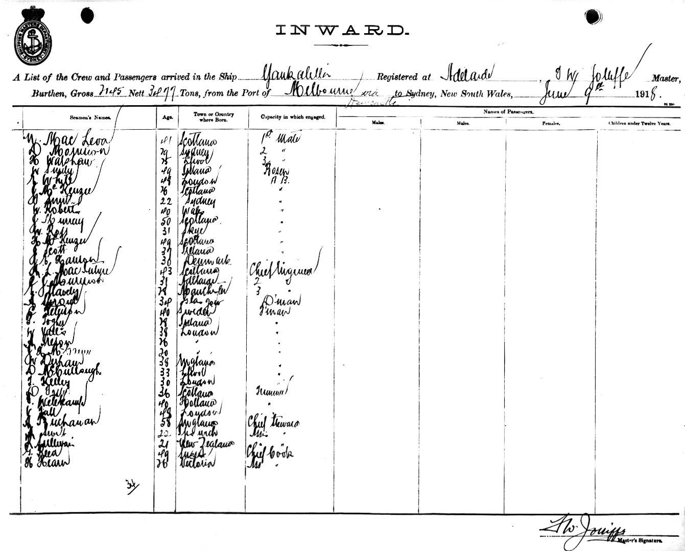 YANKALILLAOF ADELAIDE, F.W. JOLLIFFE, MASTER, BURTHEN 3477/2145 TONS FROM THE PORT OF MELBOURNE VIA NEWCASTLE TO SYDNEY, NEW SOUTH WALES, 9TH JUNE 1918 |