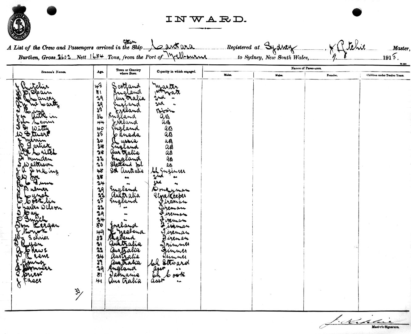 CANTARAOF SYDNEY, J. RITCHIE, MASTER, BURTHEN 2602/1654 TONS FROM THE PORT OF MELBOURNE TO SYDNEY, NEW SOUTH WALES, 9TH JUNE 1918 |