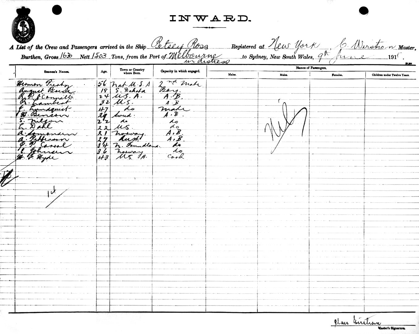 BETSY ROSSOF NEW YORK, C. WIRSTROM, MASTER, BURTHEN 1630/1503 TONS FROM THE PORT OF MELBOURNE IN DISTRESS TO SYDNEY, NEW SOUTH WALES, 9TH JUNE 1918 |