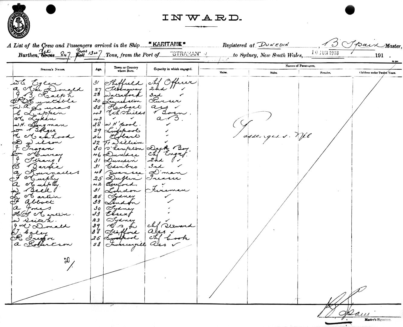 KARITANEOF DUNEDIN, B. SPAIN, MASTER, BURTHEN 1347/847 TONS FROM THE PORTS OF STRAHAN & DEVONPORT TO SYDNEY, NEW SOUTH WALES, 10TH JUNE 1918 |