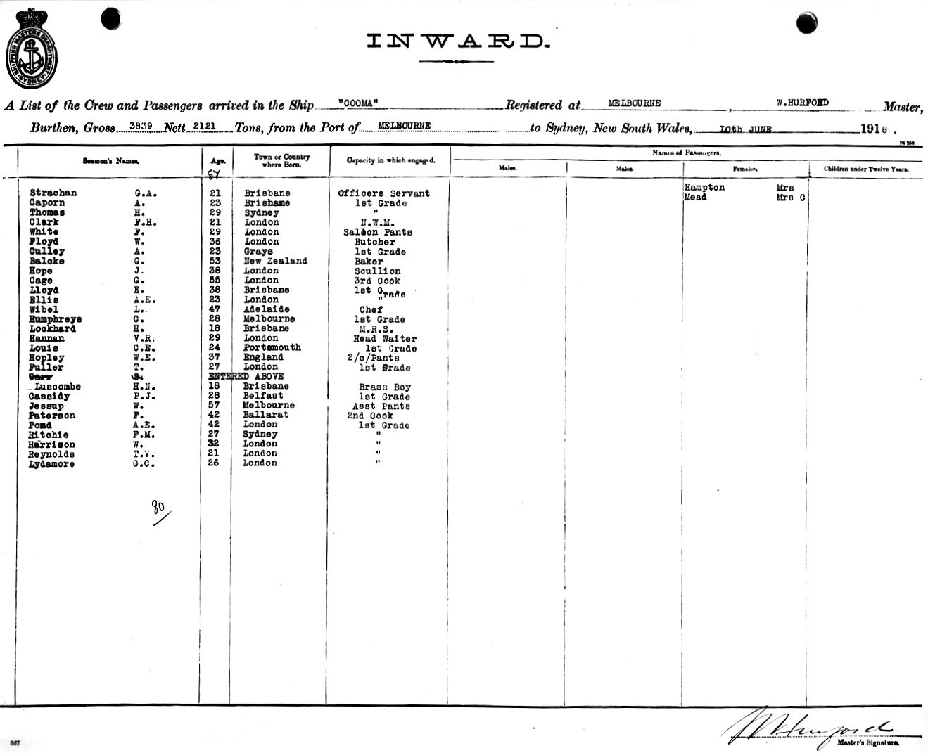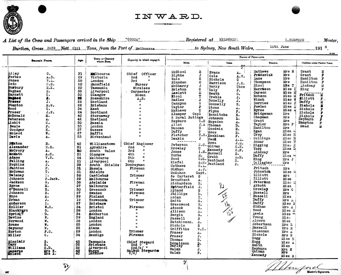 COOMAOF MELBOURNE, W. HURFORD, MASTER, BURTHEN 3839/2121 TONS FROM THE PORT OF MELBOURNE TO SYDNEY, NEW SOUTH WALES, 10TH JUNE 1918 |