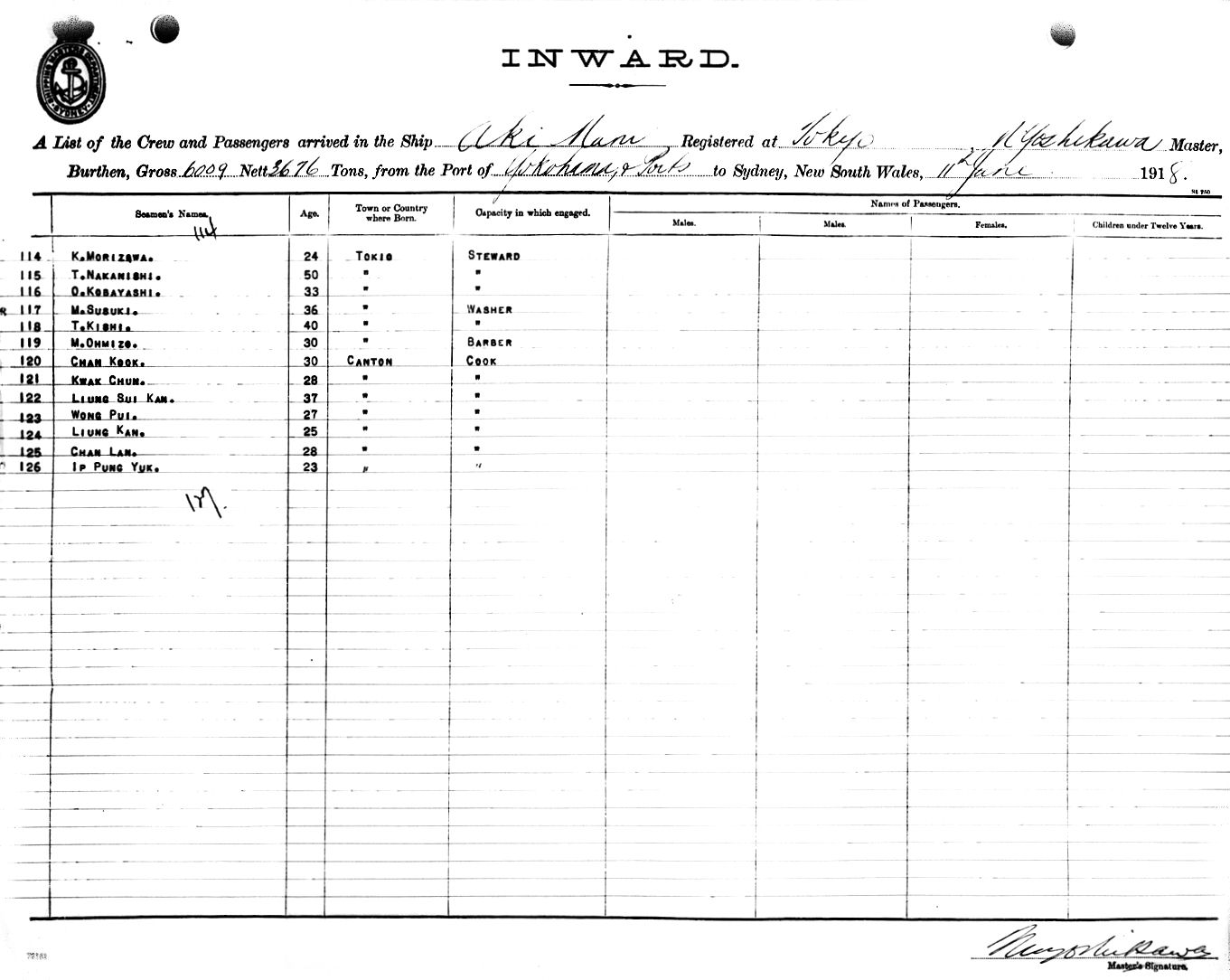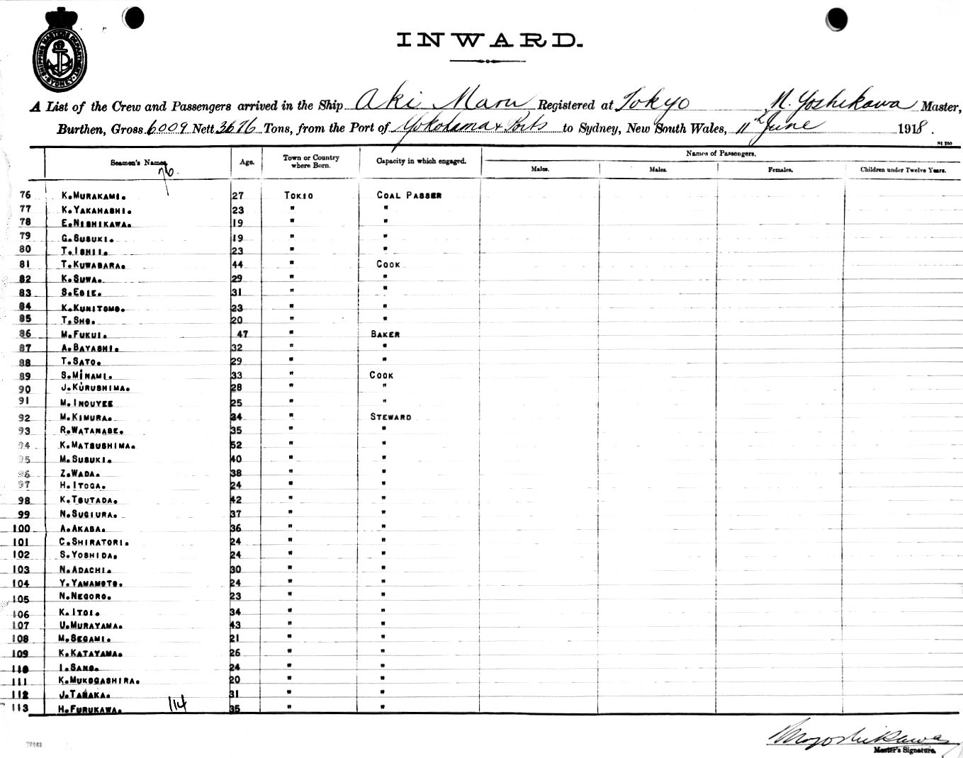 AKI MARUOF TOKIO, M. YOSHIKAWA, MASTER, BURTHEN 6009/3676 TONS FROM THE PORT OF YOKOHAMA & PORTS TO SYDNEY, NEW SOUTH WALES, 11TH JUNE 1918 |