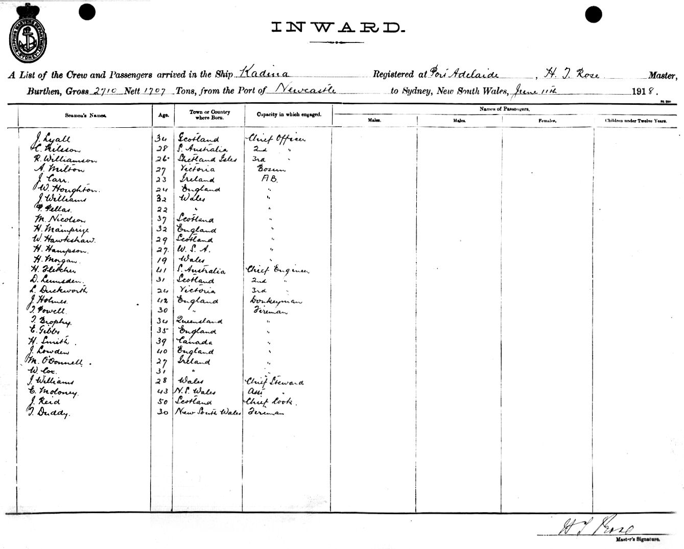 KADINAOF PORT ADELAIDE, H.T. ROSE, MASTER, BURTHEN 2710/1707 TONS FROM THE PORT OF NEWCASTLE TO SYDNEY, NEW SOUTH WALES, 11TH JUNE 1918 |