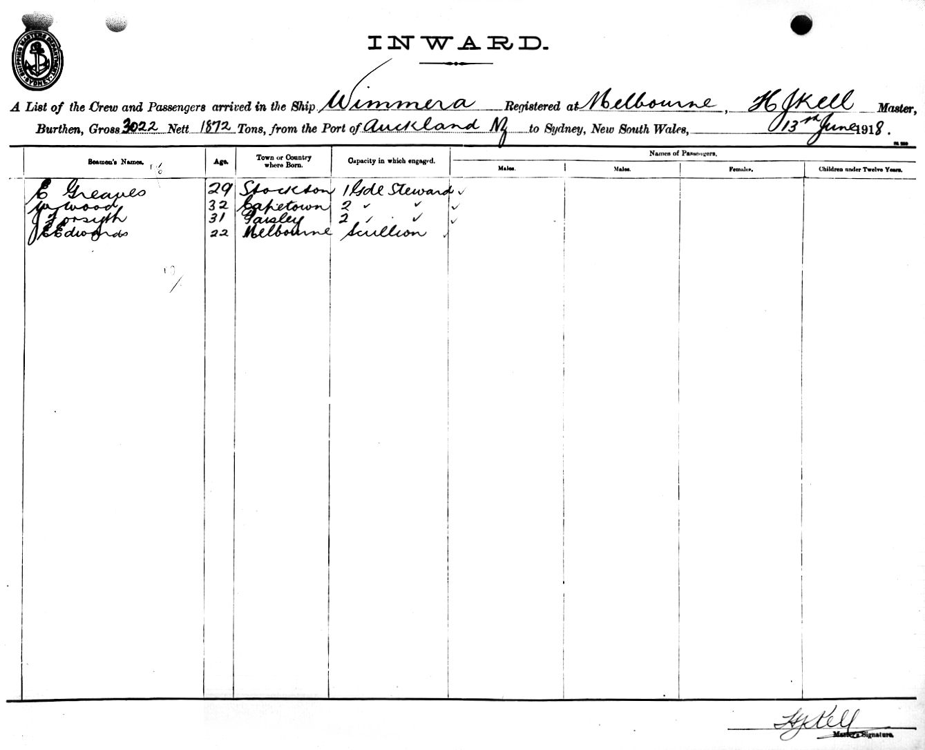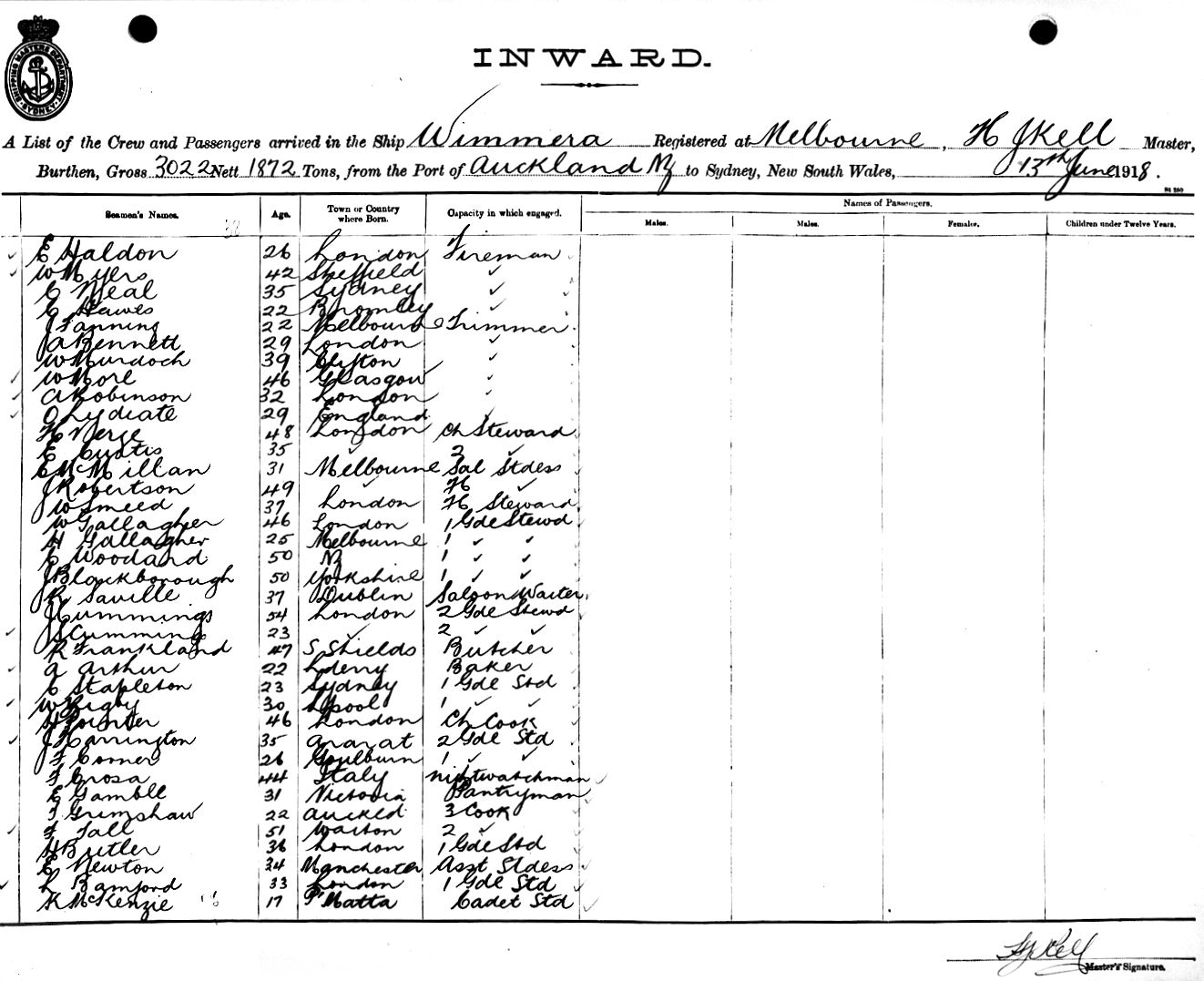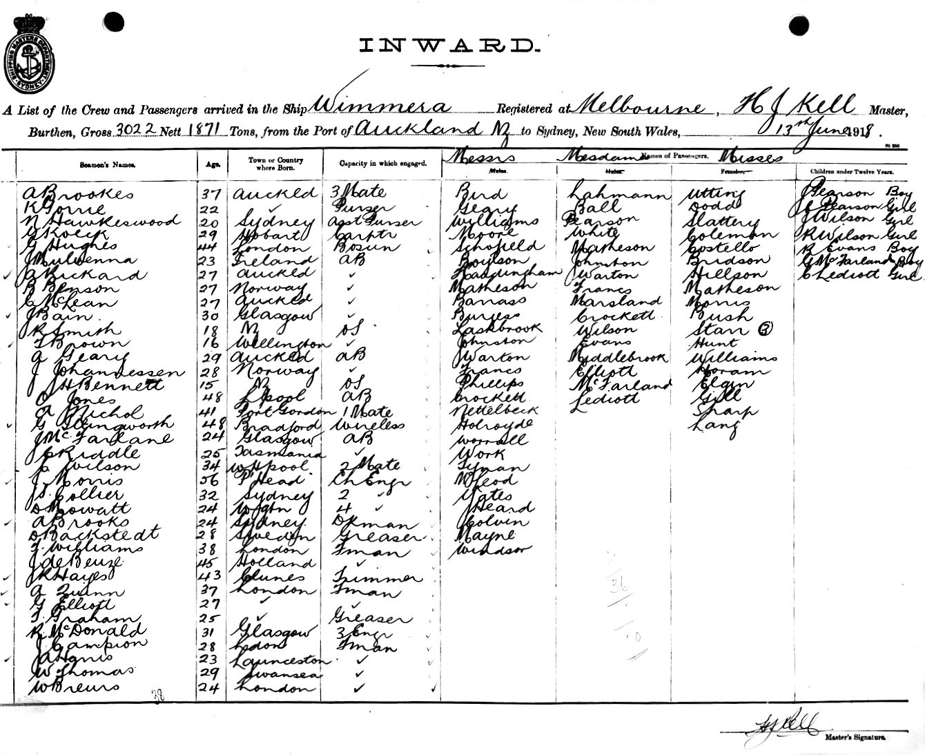 WIMMERAOF MELBOURNE, H.J. KELL, MASTER, BURTHEN 3022/1871 TONS FROM THE PORT OF AUCKLAND N.Z. TO SYDNEY, NEW SOUTH WALES, 13TH JUNE 1918 |