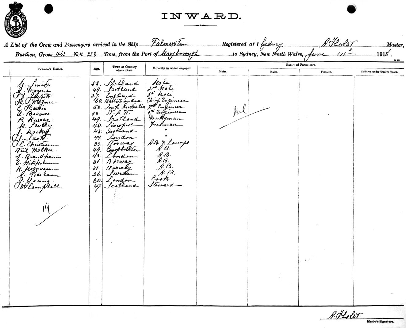 PALMERSTONOF SYDNEY, A. HOLST, MASTER, BURTHEN 463/238 TONS FROM THE PORT OF MARYBOROUGH TO SYDNEY, NEW SOUTH WALES, 14TH JUNE 1918 |