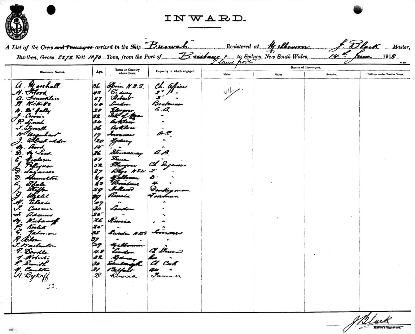 BURWAHOF MELBOURNE, J. BLACK, MASTER, BURTHEN 2272/1070 TONS FROM THE PORT OF BRISBANE & QUEENSLAND PORTS TO SYDNEY, NEW SOUTH WALES, 14TH JUNE 1918 |