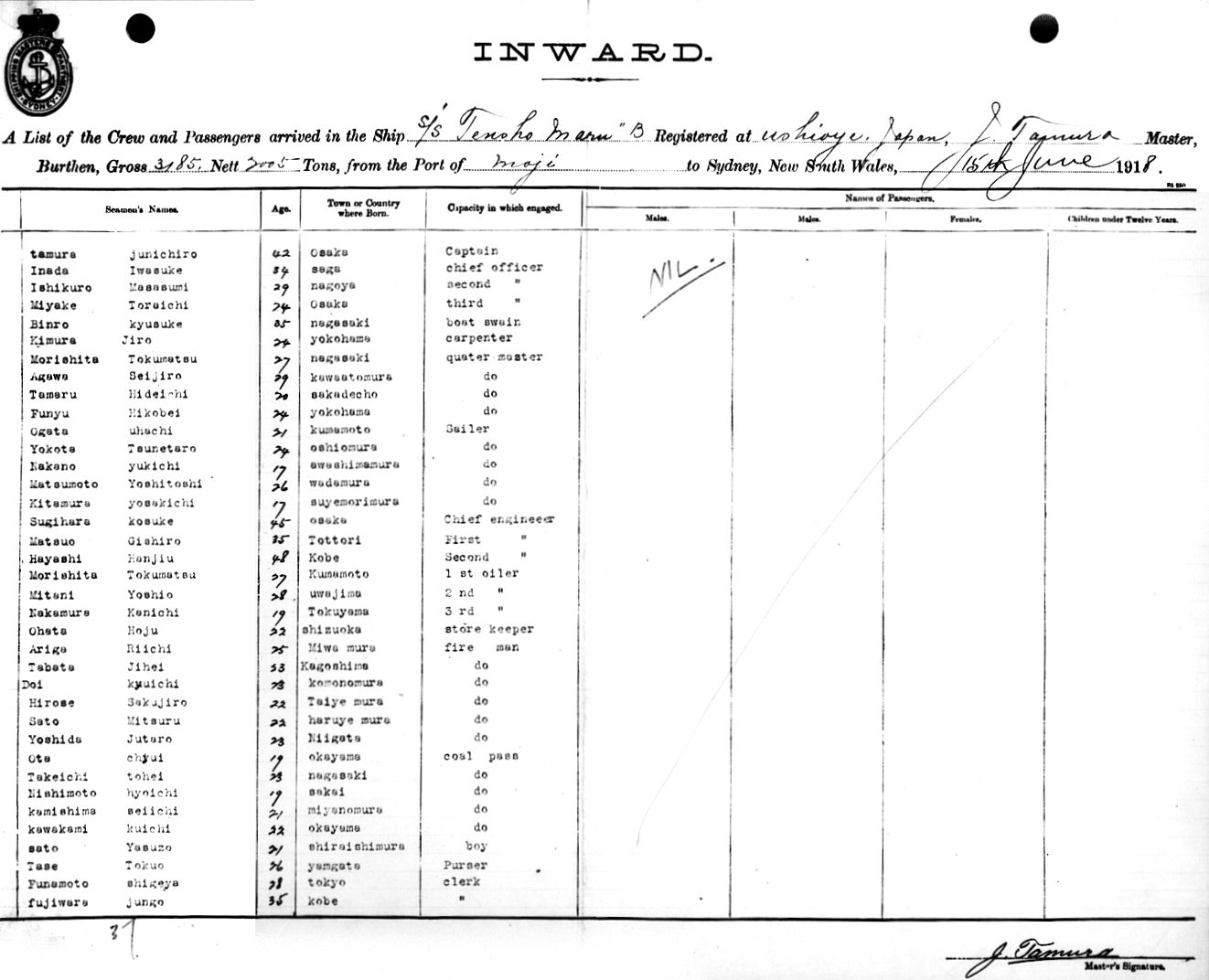 TENSHO MARUOF USHIOYE, JAPAN, J. TAMURA, MASTER, BURTHEN 3185/2005 TONS FROM THE PORT OF MOJI TO SYDNEY, NEW SOUTH WALES, 15TH JUNE 1918 |