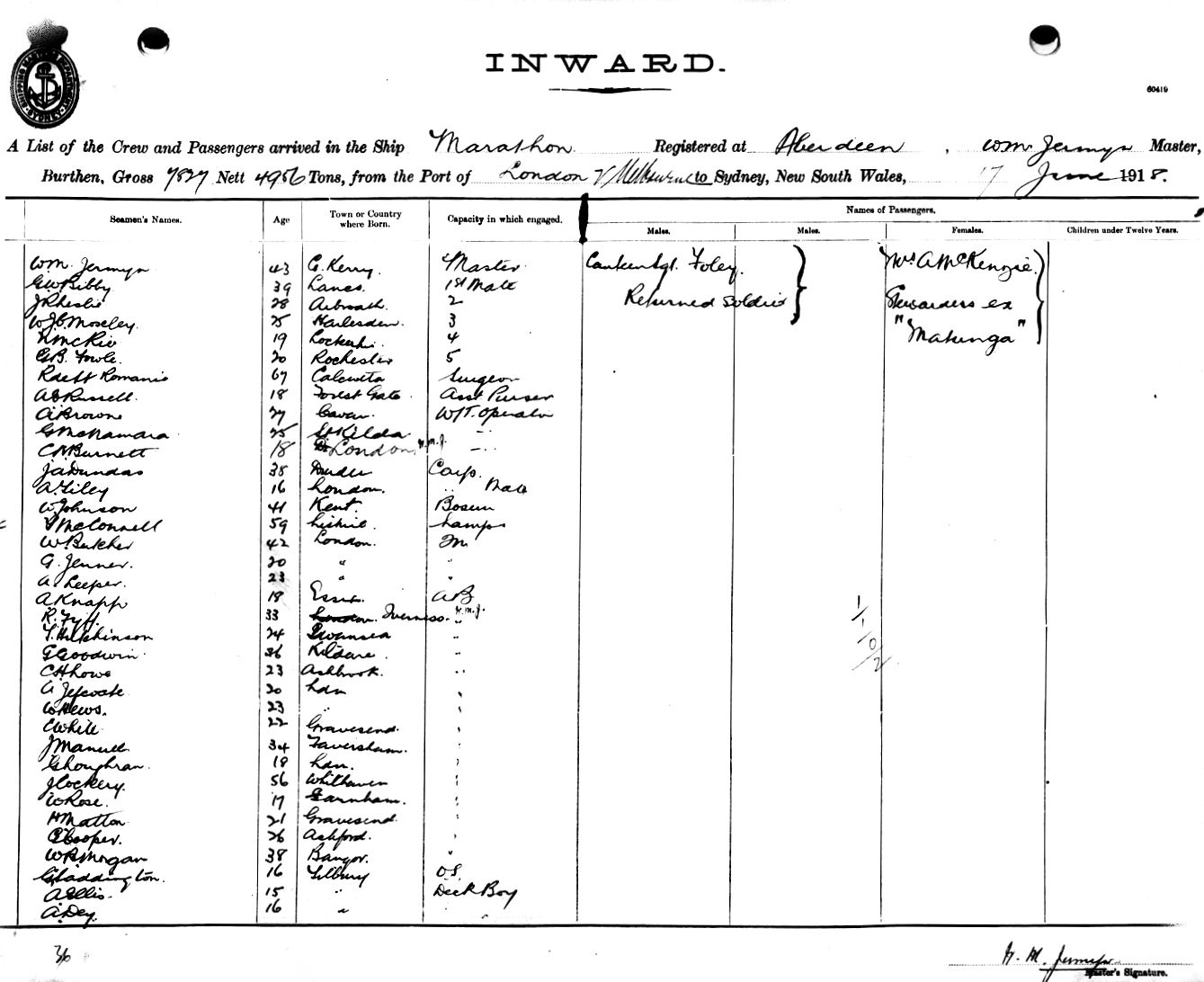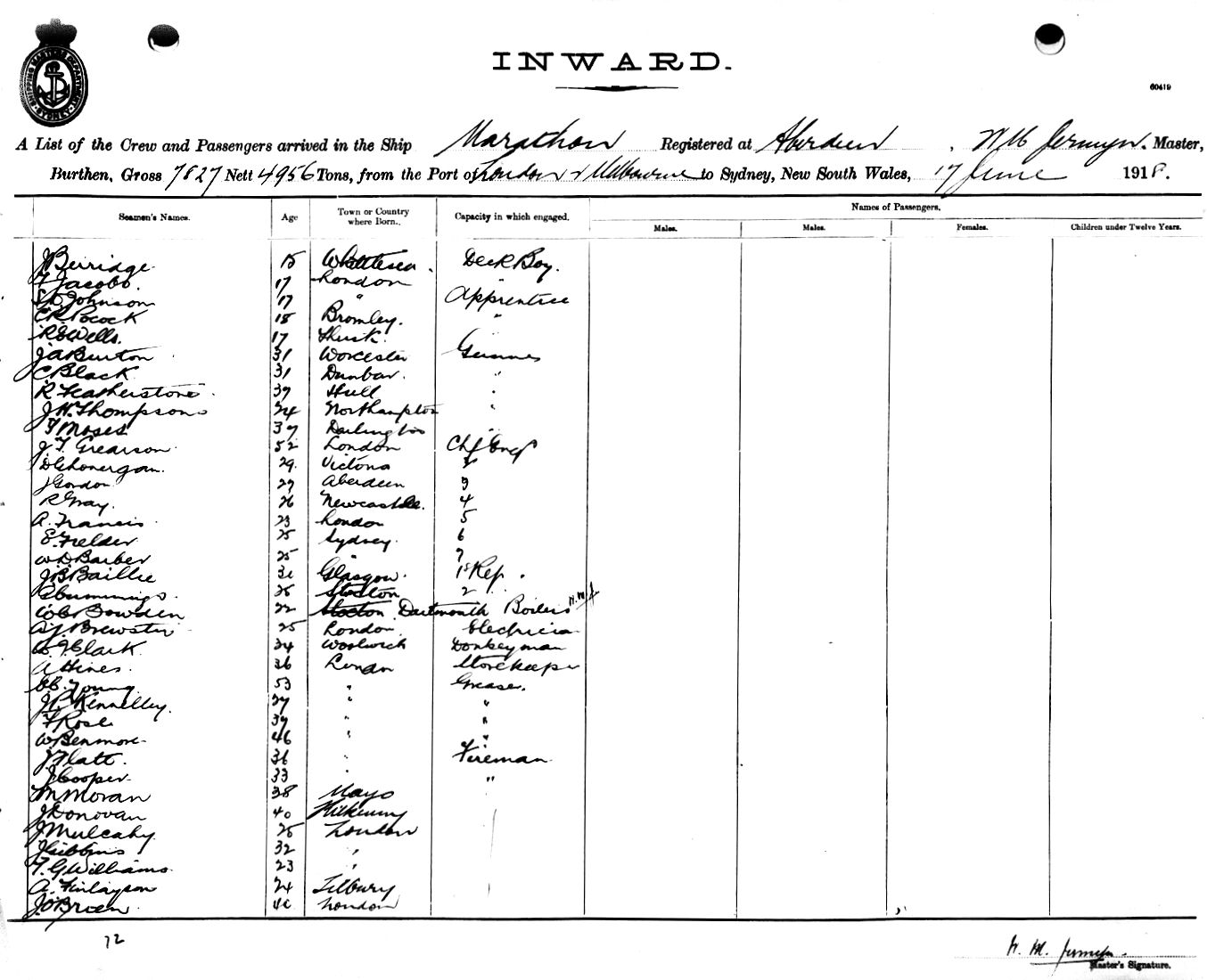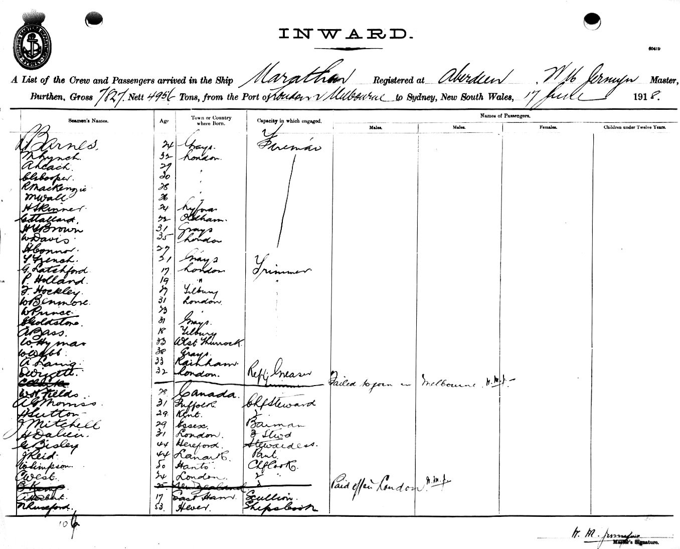 MARATHONOF ABERDEEN, W.M. JERMYN, MASTER, BURTHEN 7827/4956 TONS FROM THE PORT OF LONDON via MELBOURNE TO SYDNEY, NEW SOUTH WALES, 17TH JUNE 1918 |