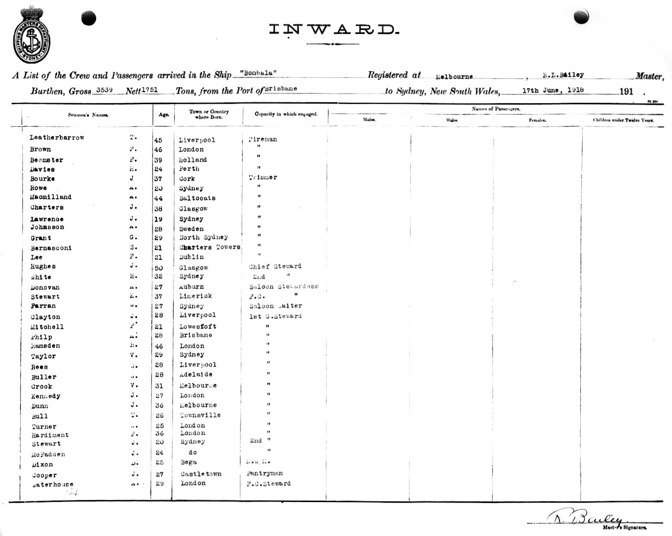 BOMBALAOF MELBOURNE, R.L. BAILEY, MASTER, BURTHEN 3539/1751 TONS FROM THE PORT OF BRISBANE & Q'LAND PORTS TO SYDNEY, NEW SOUTH WALES, 17TH JUNE 1918 |