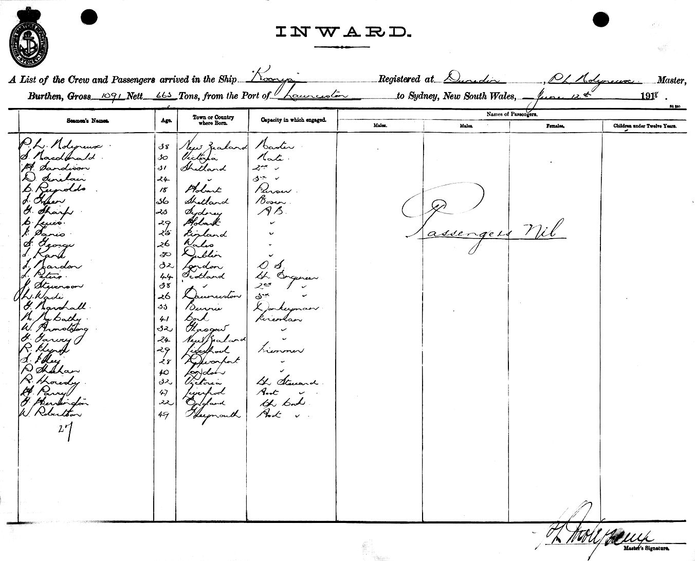 KOONYAOF DUNDEDIN, P.L. MOLYNEUX, MASTER, BURTHEN 1091/663 TONS FROM THE PORT OF LAUNCESTON TO SYDNEY, NEW SOUTH WALES, 12TH JUNE 1918 |