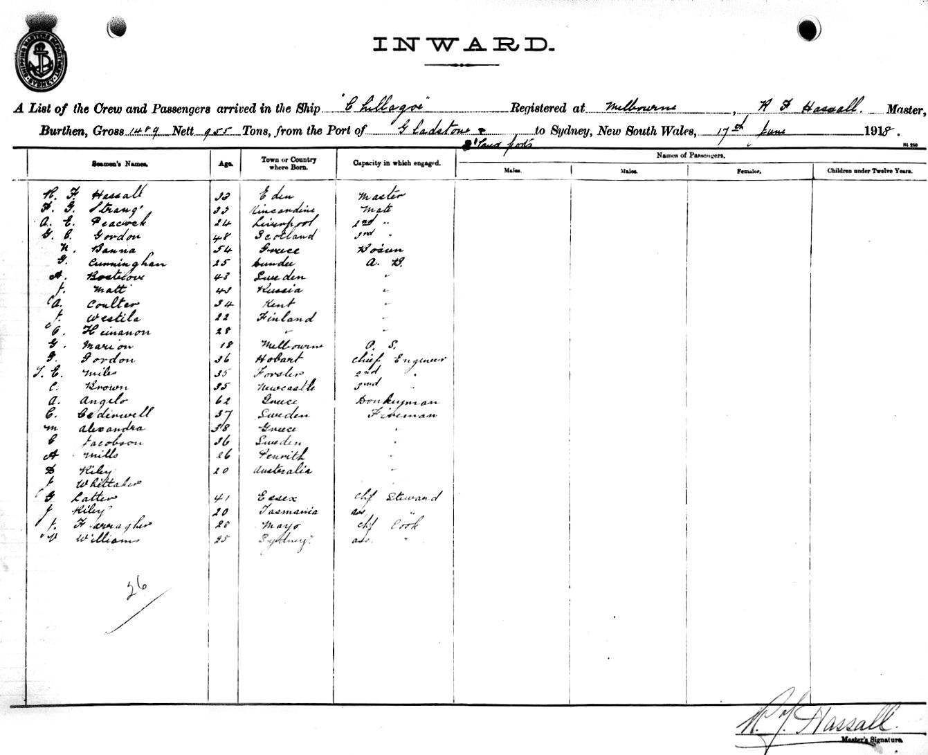 CHILLAGOEOF MELBOURNE, R.F. HASSALL, MASTER, BURTHEN 1489/955 TONS FROM THE PORT OF GLADSTONE & QUEENSLAND PORTS TO SYDNEY, NEW SOUTH WALES, 17TH JUNE 1918 |