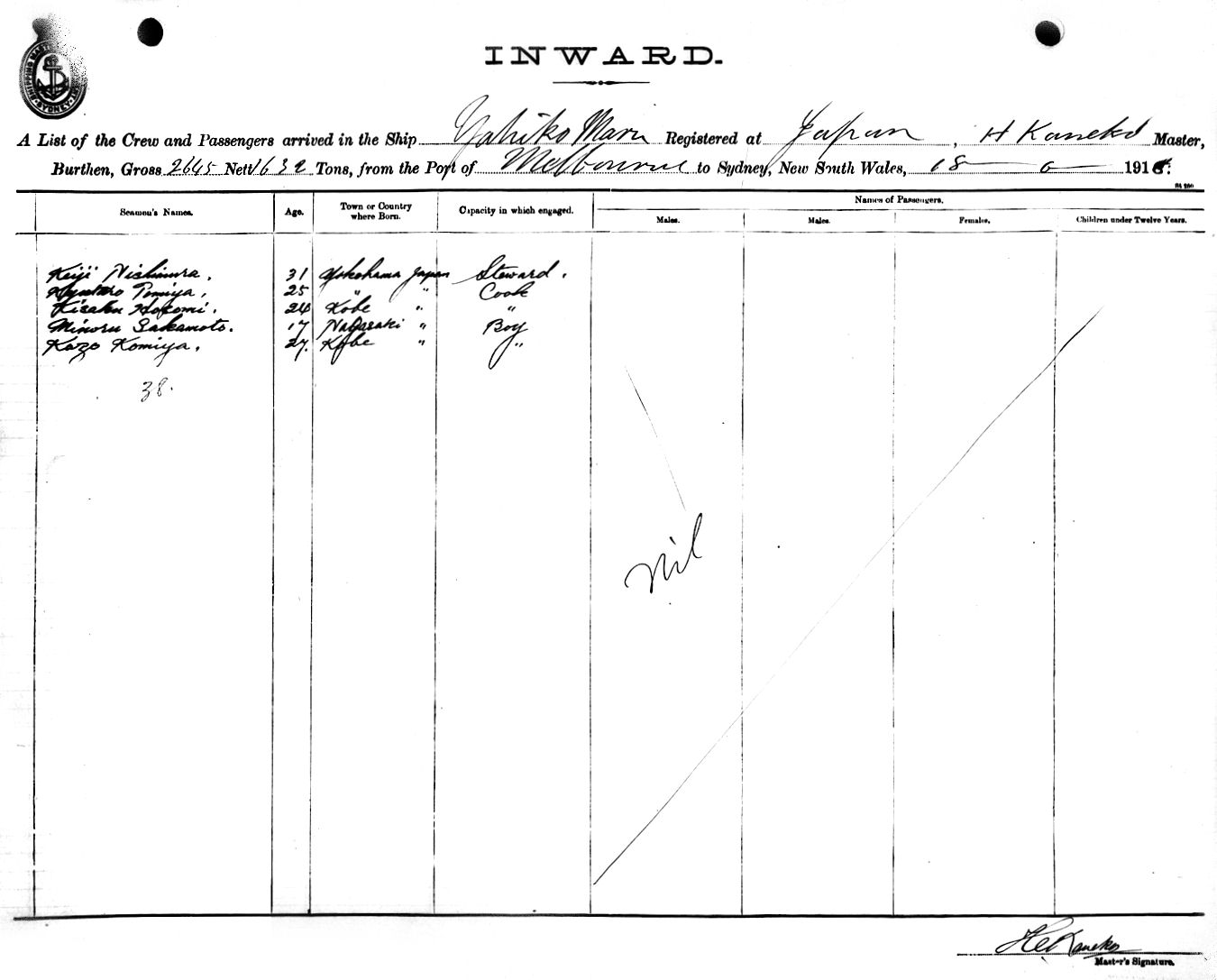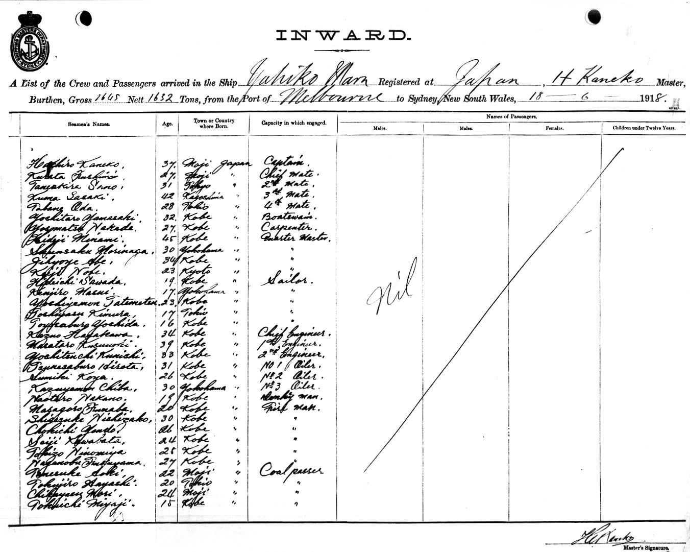 Mariners and ships in Australian Waters | YAHIKO MARUOF JAPAN, H. KANEKO, MASTER, BURTHEN 2645/1632 TONS FROM THE PORT OF MELBOURNE TO SYDNEY, NEW SOUTH WALES, 18TH JUNE 1918 |