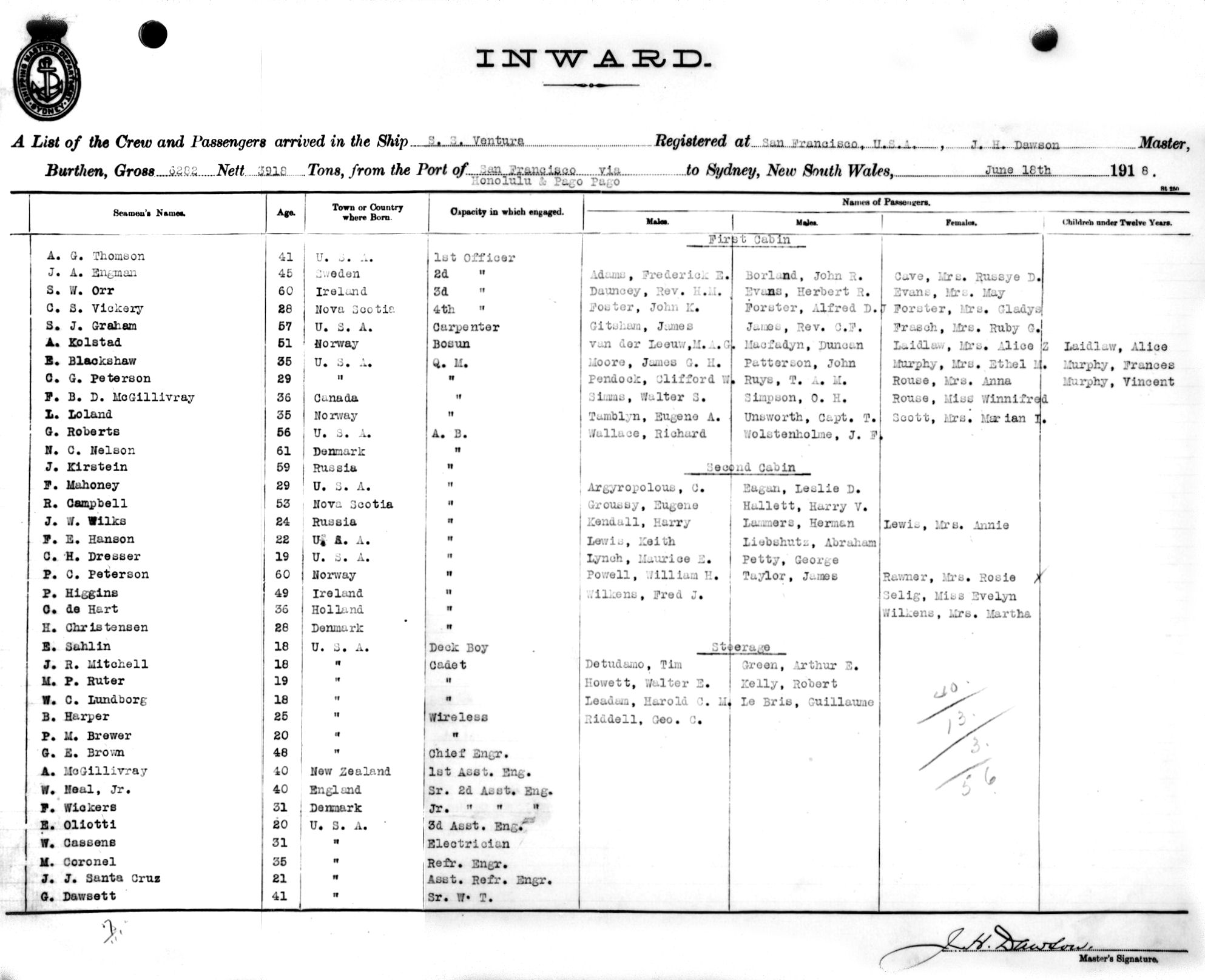VENTURAOF SAN FRANCISCO, U.S.A., J.H. DAWSON, MASTER, BURTHEN 6282/3918 TONS FROM THE PORT OF SAN FRANCISCO via HOLOLULU & PAGO PAGO TO SYDNEY, NEW SOUTH WALES, 18TH JUNE 1918 |