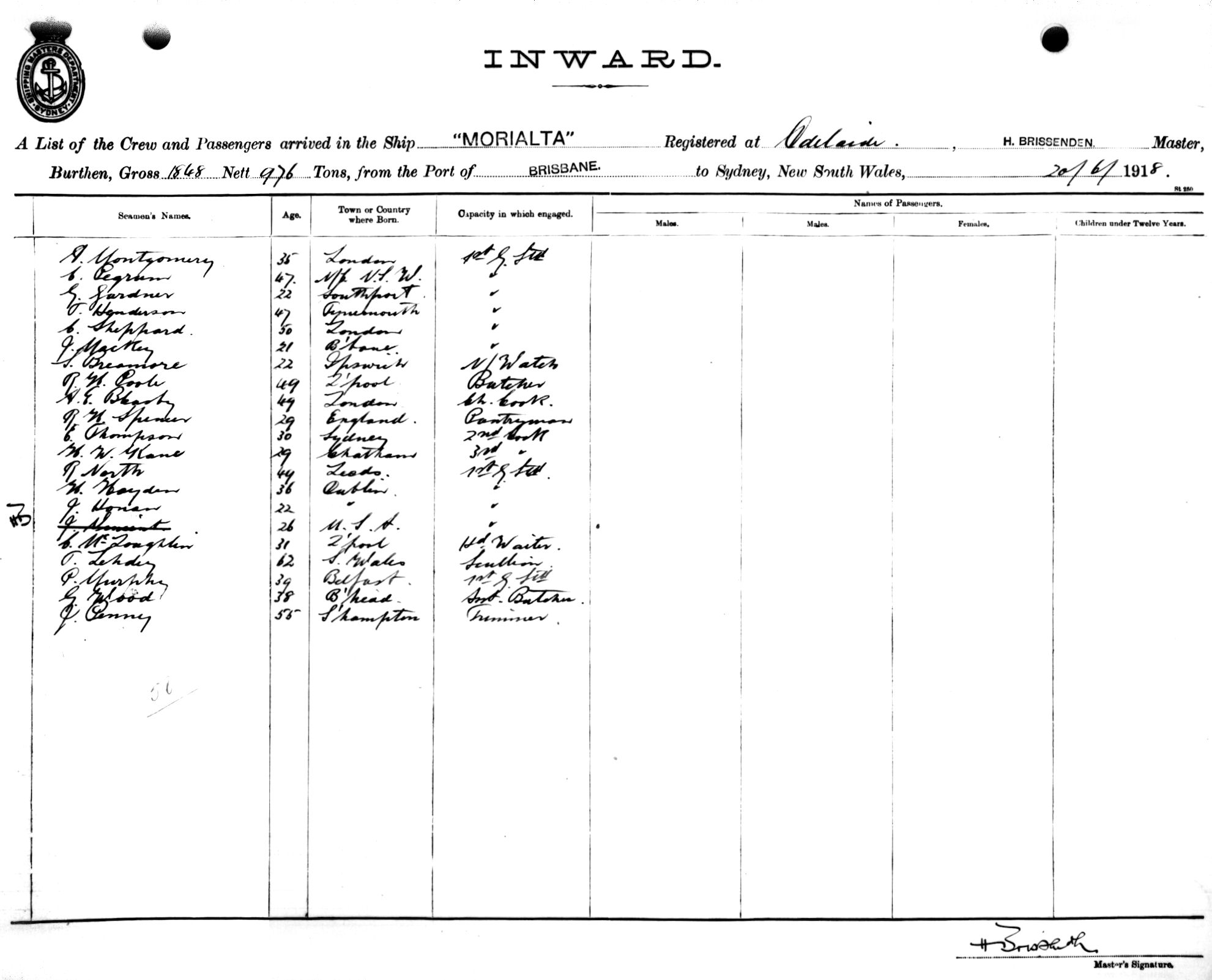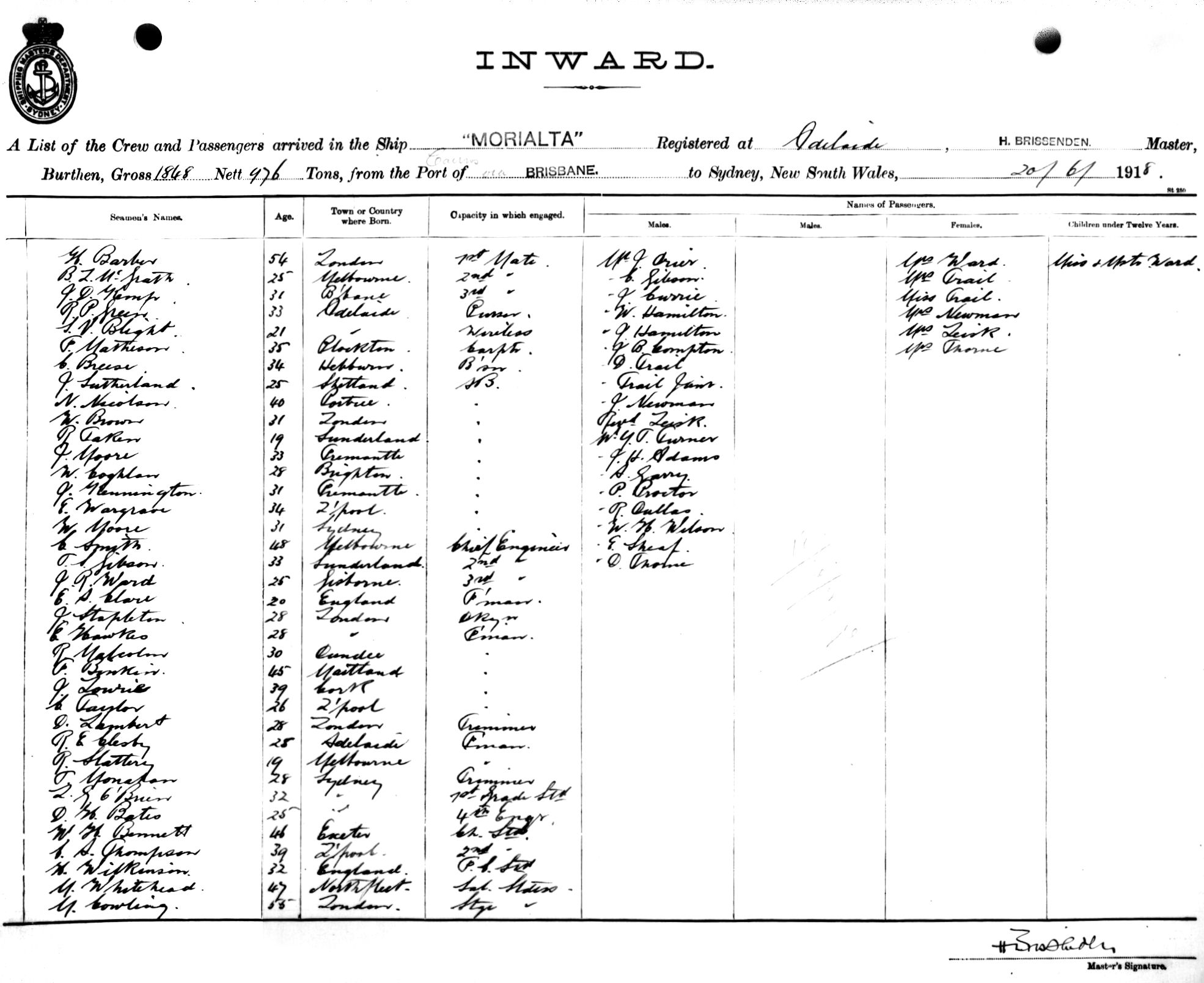 MORIALTAOF ADELAIDE, H. BRISSENDEN, MASTER, BURTHEN 1848/976 TONS FROM THE PORT OF CAIRNS via BRISBANE TO SYDNEY, NEW SOUTH WALES, 20TH JUNE 1918 |