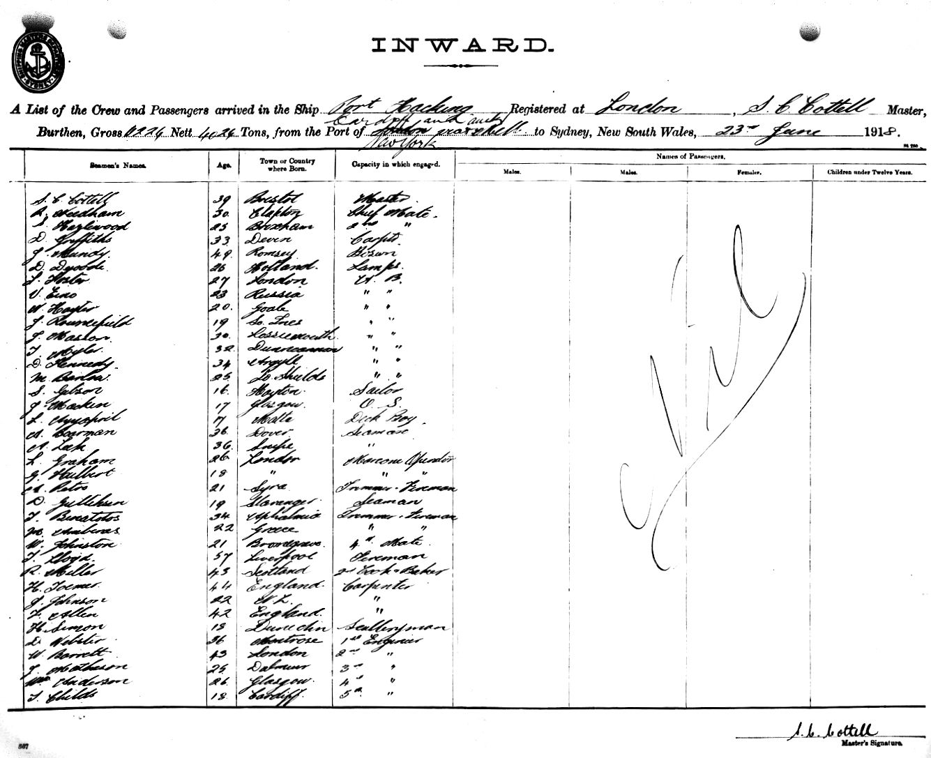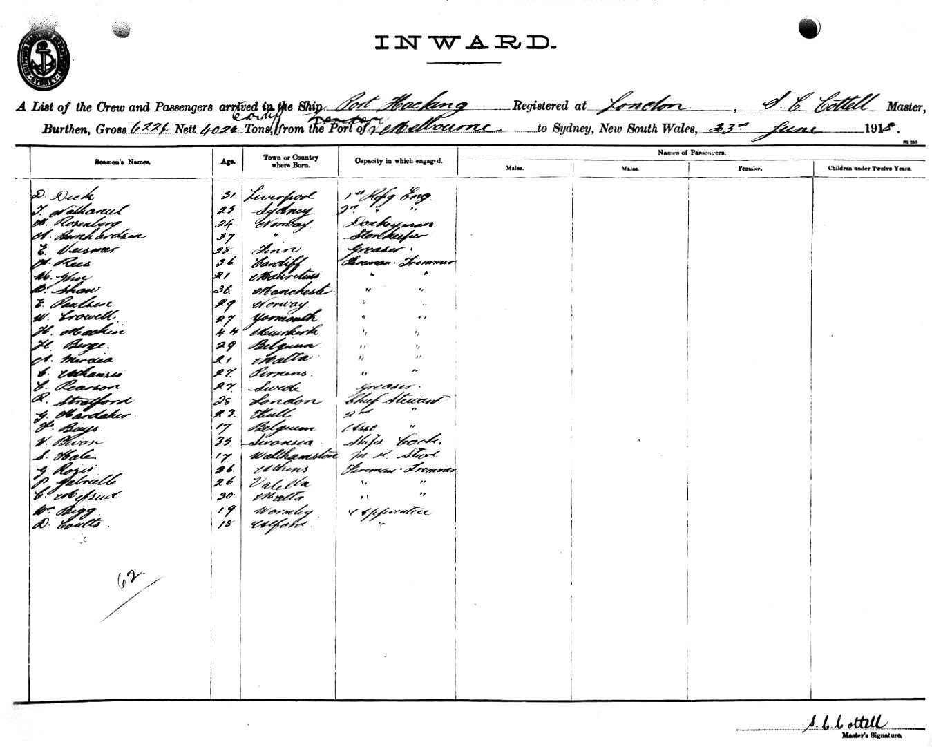 PORT HACKINGOF LONDON, S.C. COTTELL, MASTER, BURTHEN 6224/4024 TONS FROM THE PORT OF CARDIFF & NEW YORK via AUCKLAND & MELBOURNE TO SYDNEY, NEW SOUTH WALES, 23RD JUNE 1918 |