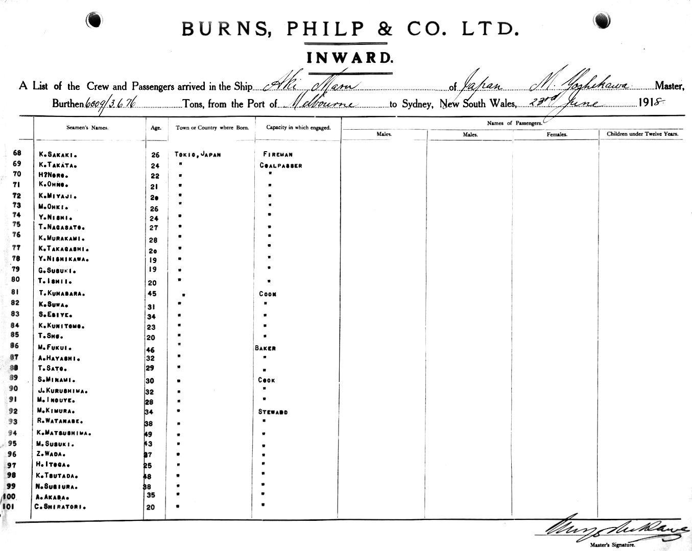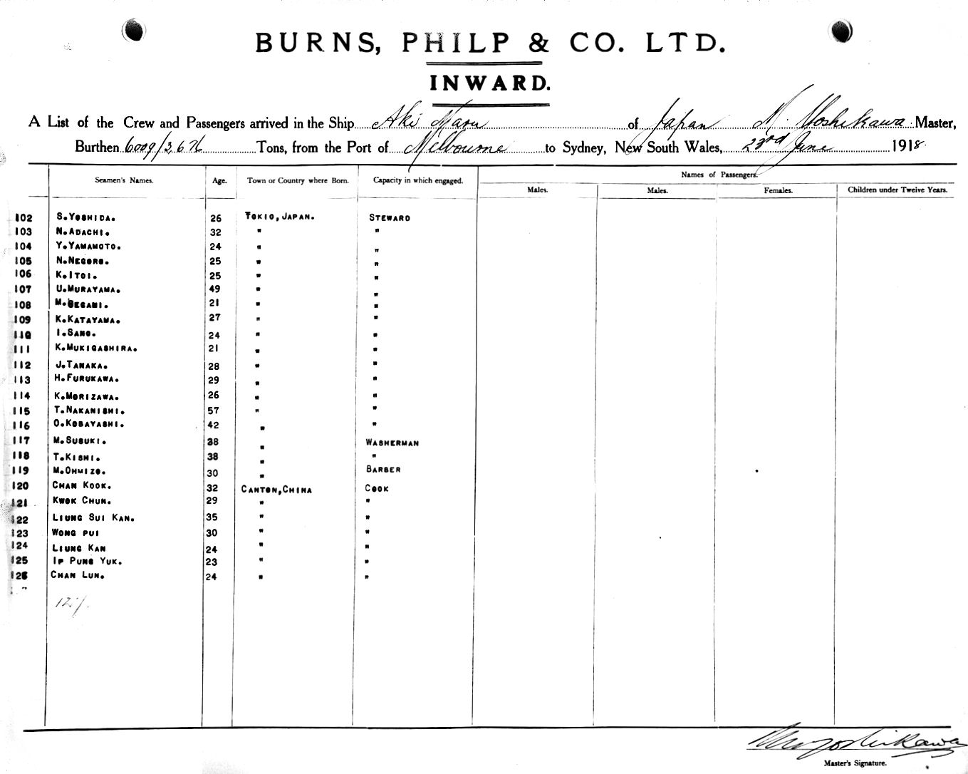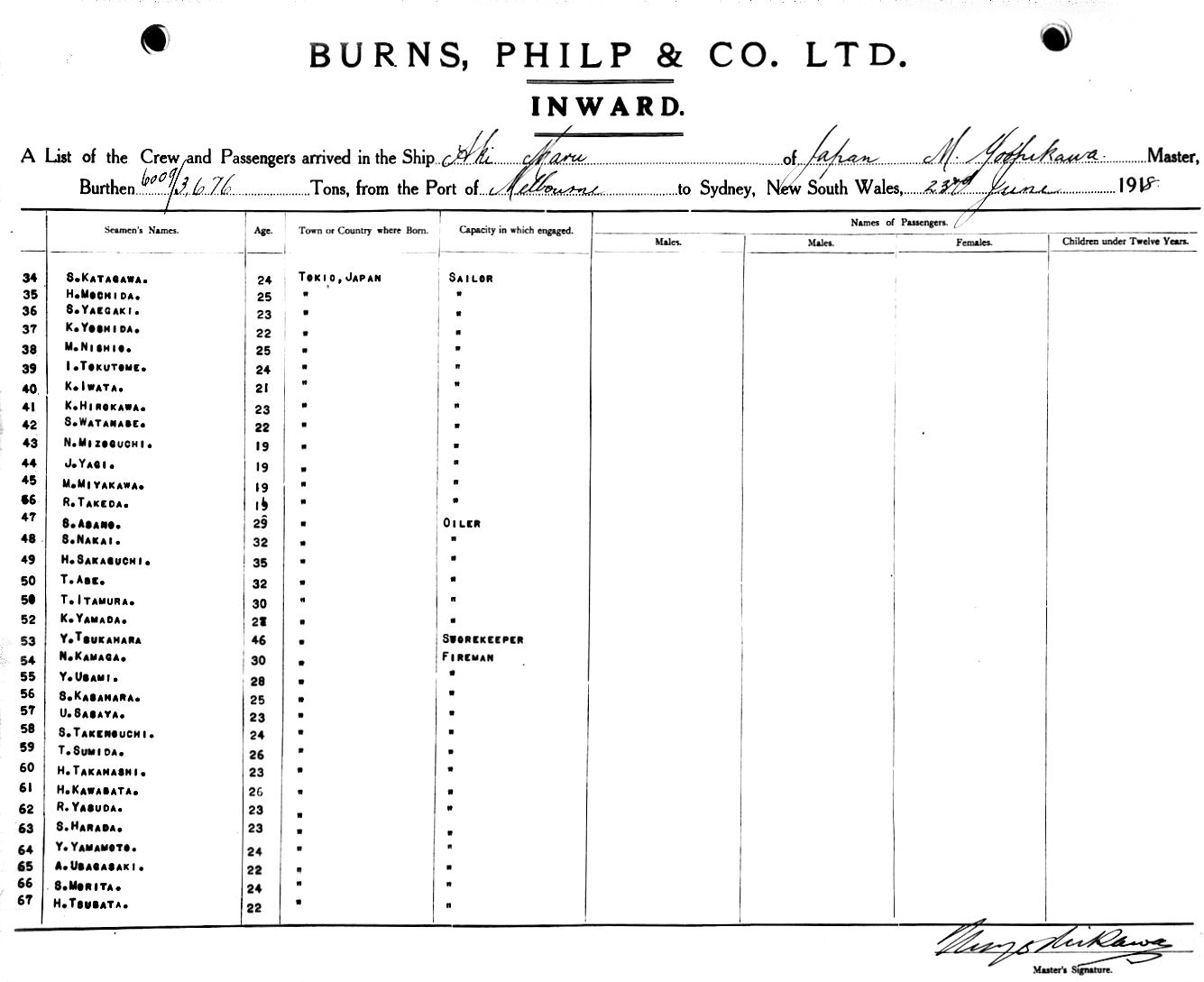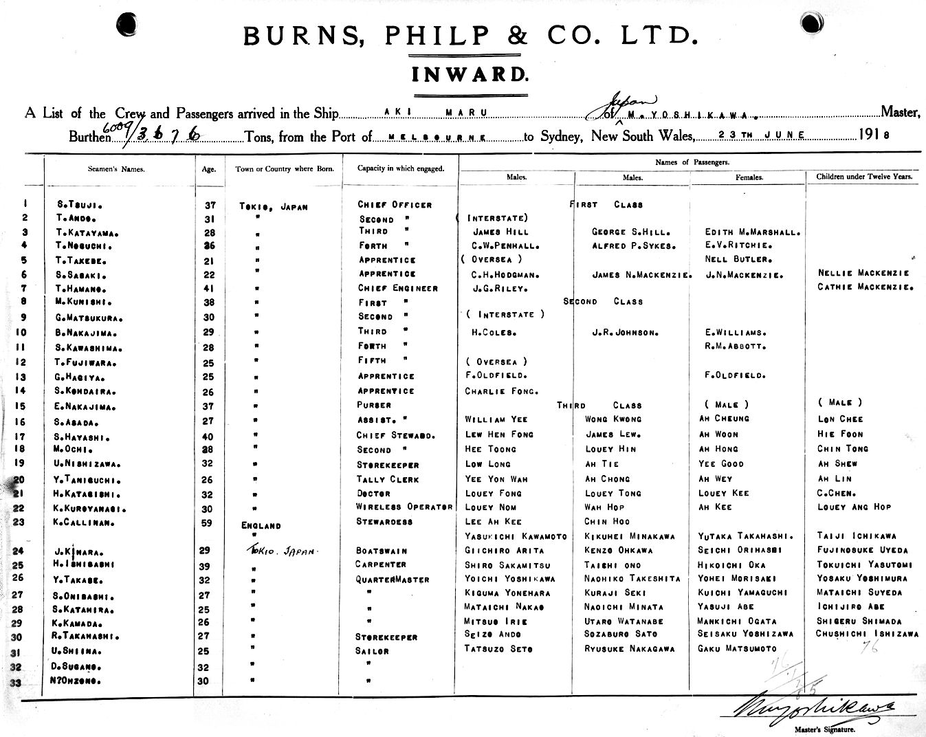 Mariners and ships in Australian Waters | AKI MARUOF JAPAN, M. YOSHIKAWA, MASTER, BURTHEN 6009/3676 TONS FROM THE PORT OF MELBOURNE TO SYDNEY, NEW SOUTH WALES, 23RD JUNE 1918 |