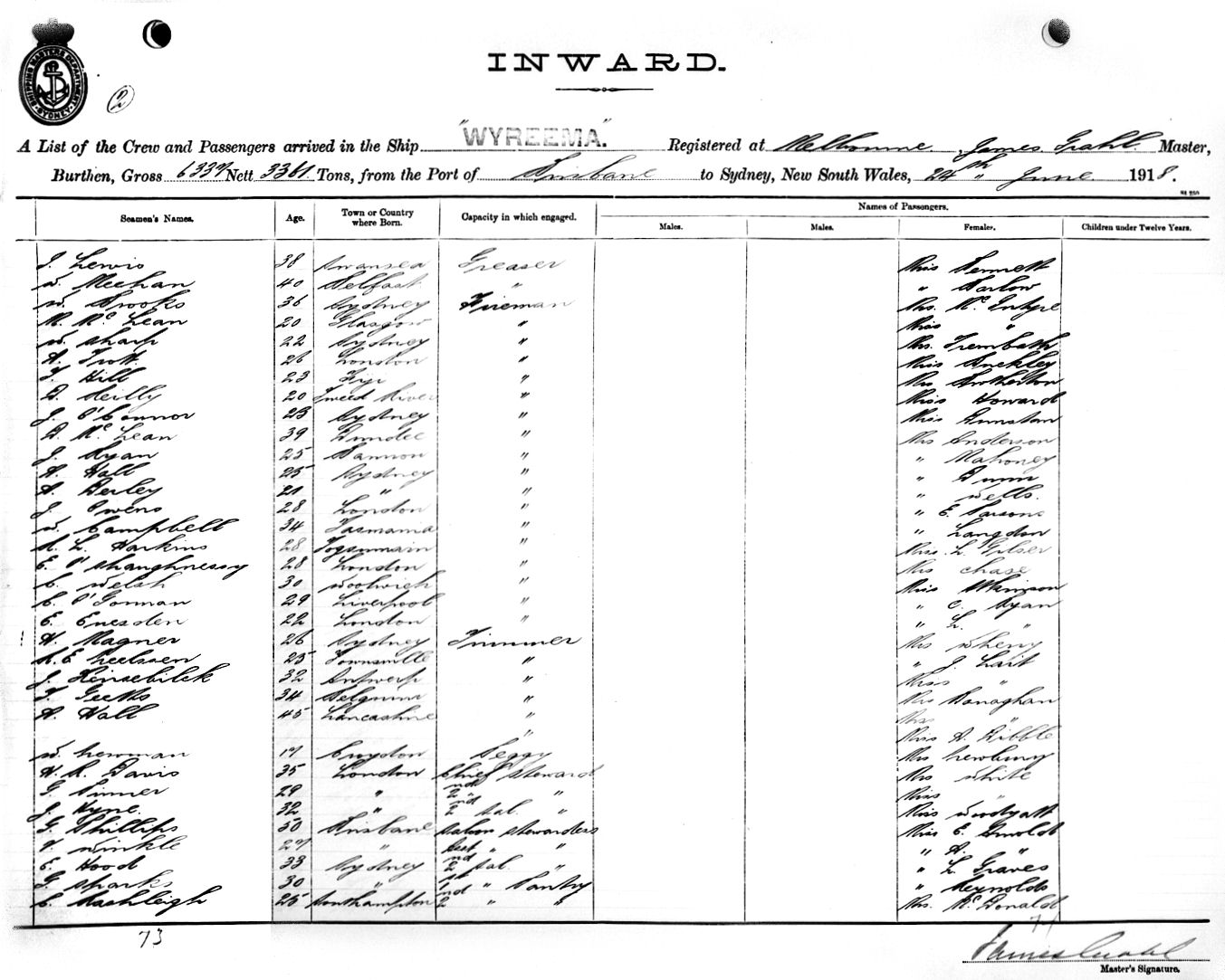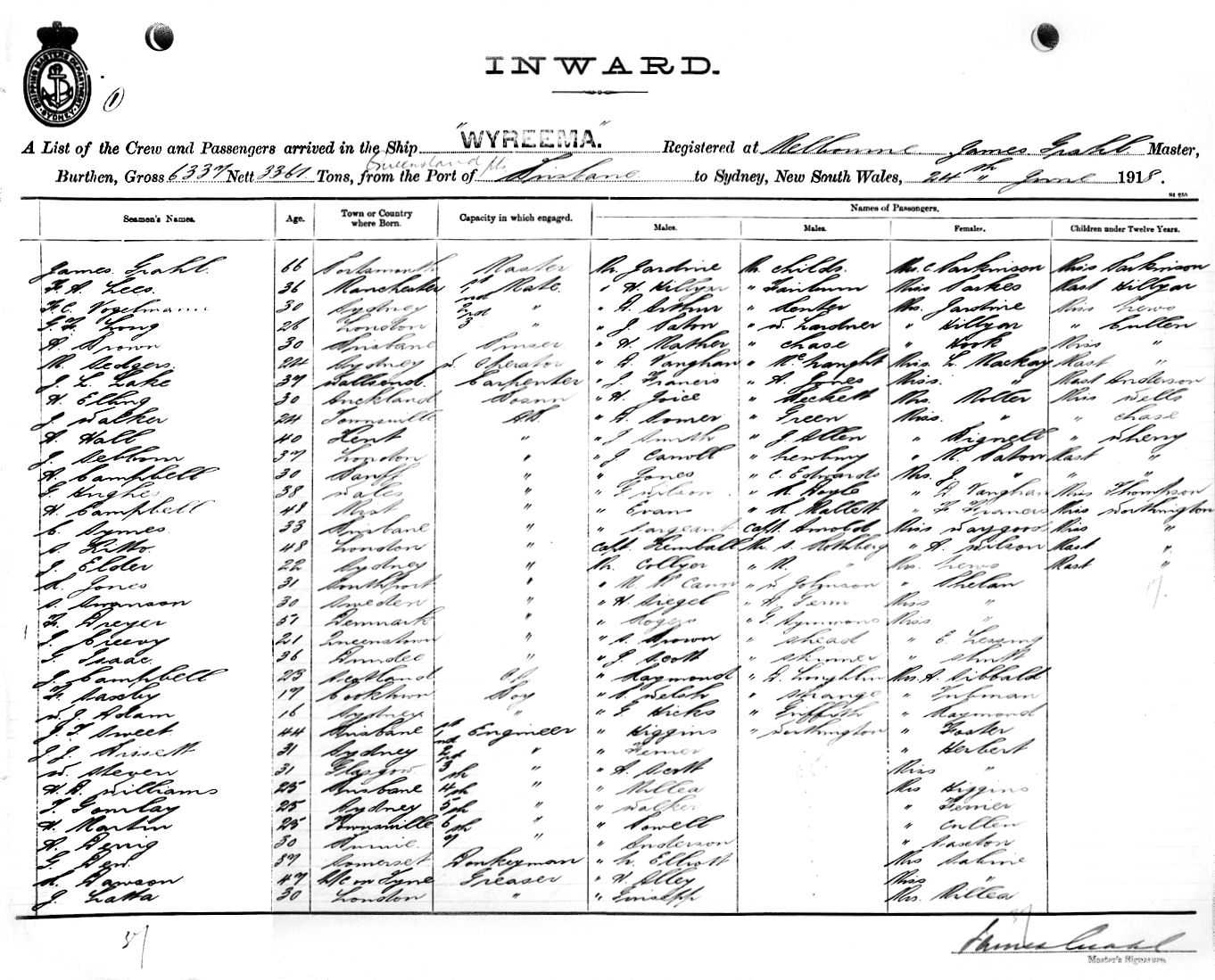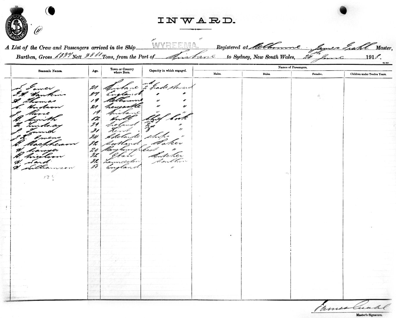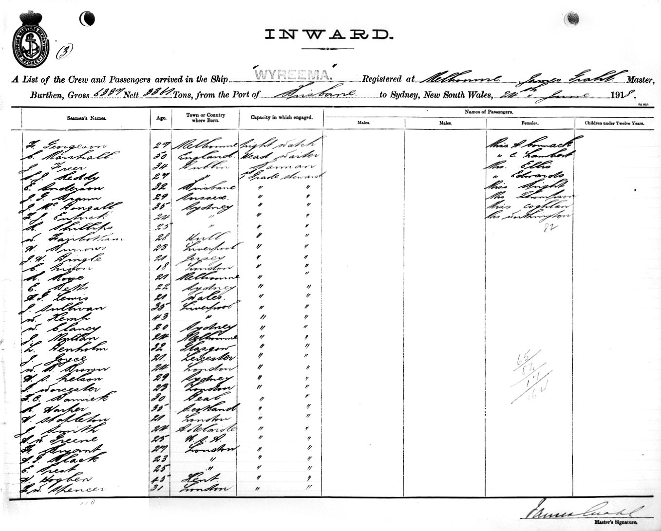 WYREEMAOF MELBOURNE, JAMES GRAHL, MASTER, BURTHEN 6337/3361 TONS FROM QUEENSLAND PORTS via BRISBANE TO SYDNEY, NEW SOUTH WALES, 24TH JUNE 1918 |
