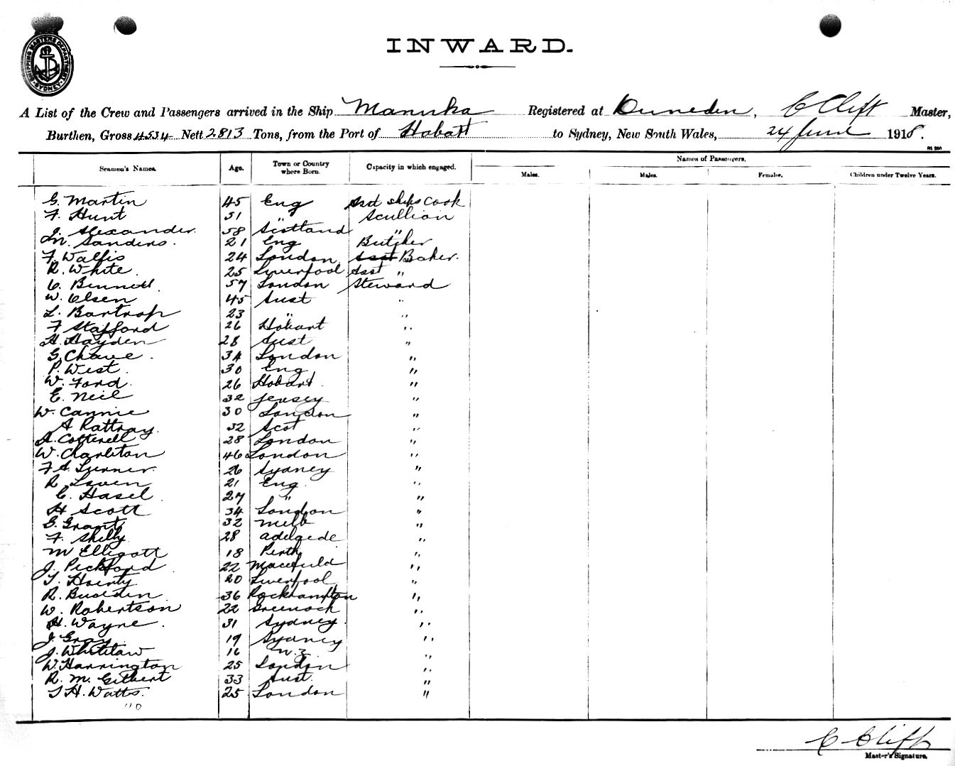 MANUKAOF DUNEDIN, C. CLIFT, MASTER, BURTHEN 4534/2813 TONS FROM THE PORT OF HOBART TO SYDNEY, NEW SOUTH WALES, 24TH JUNE 1918 |