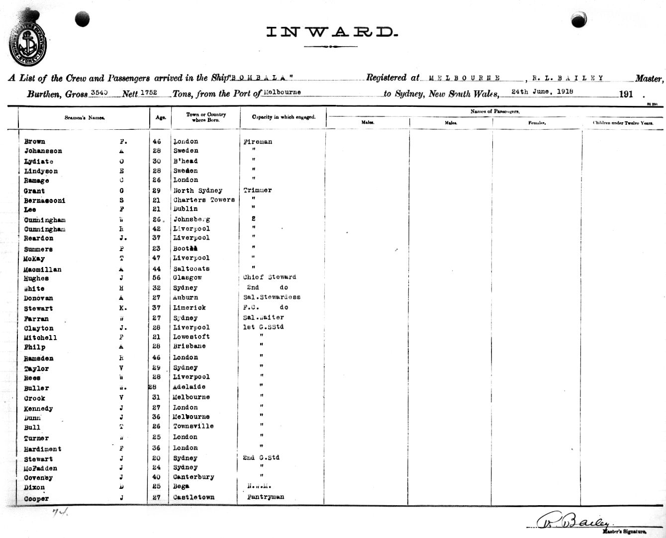 BOMBALAOF MELBOURNE, R.L. BAILEY, MASTER, BURTHEN 3540/1752 TONS FROM THE PORT OF MELBOURNE TO SYDNEY, NEW SOUTH WALES, 24TH JUNE 1918 |