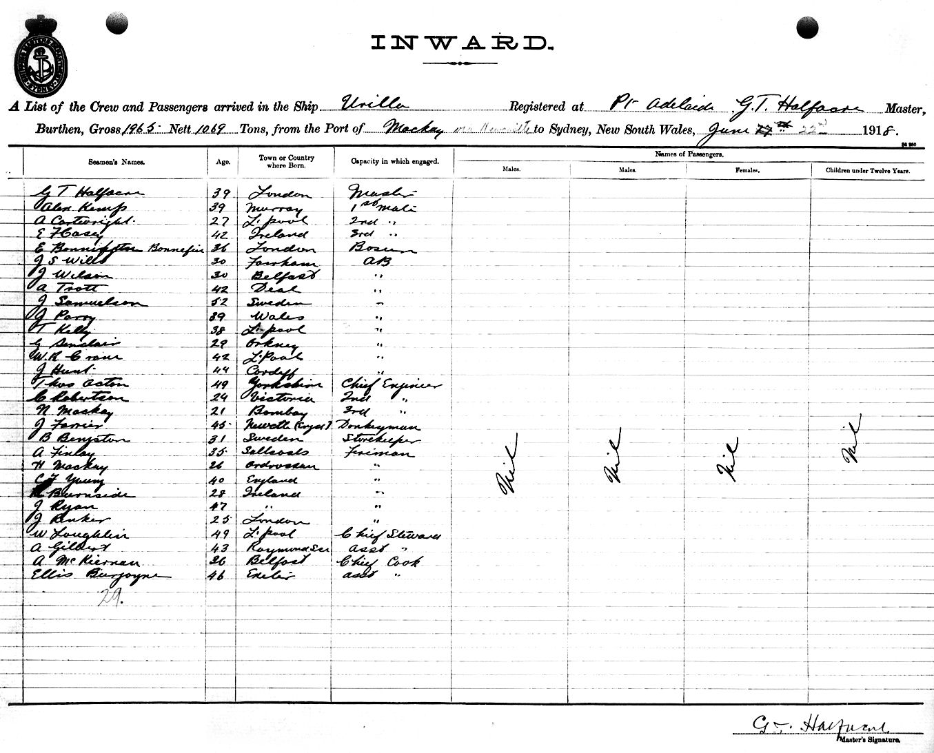URILLAOF PORT ADELAIDE, G. T. HALFACRE, MASTER, BURTHEN 1965/1069 TONS FROM THE PORT OF MACKAY TO SYDNEY, NEW SOUTH WALES, 22ND JUNE 1918 |