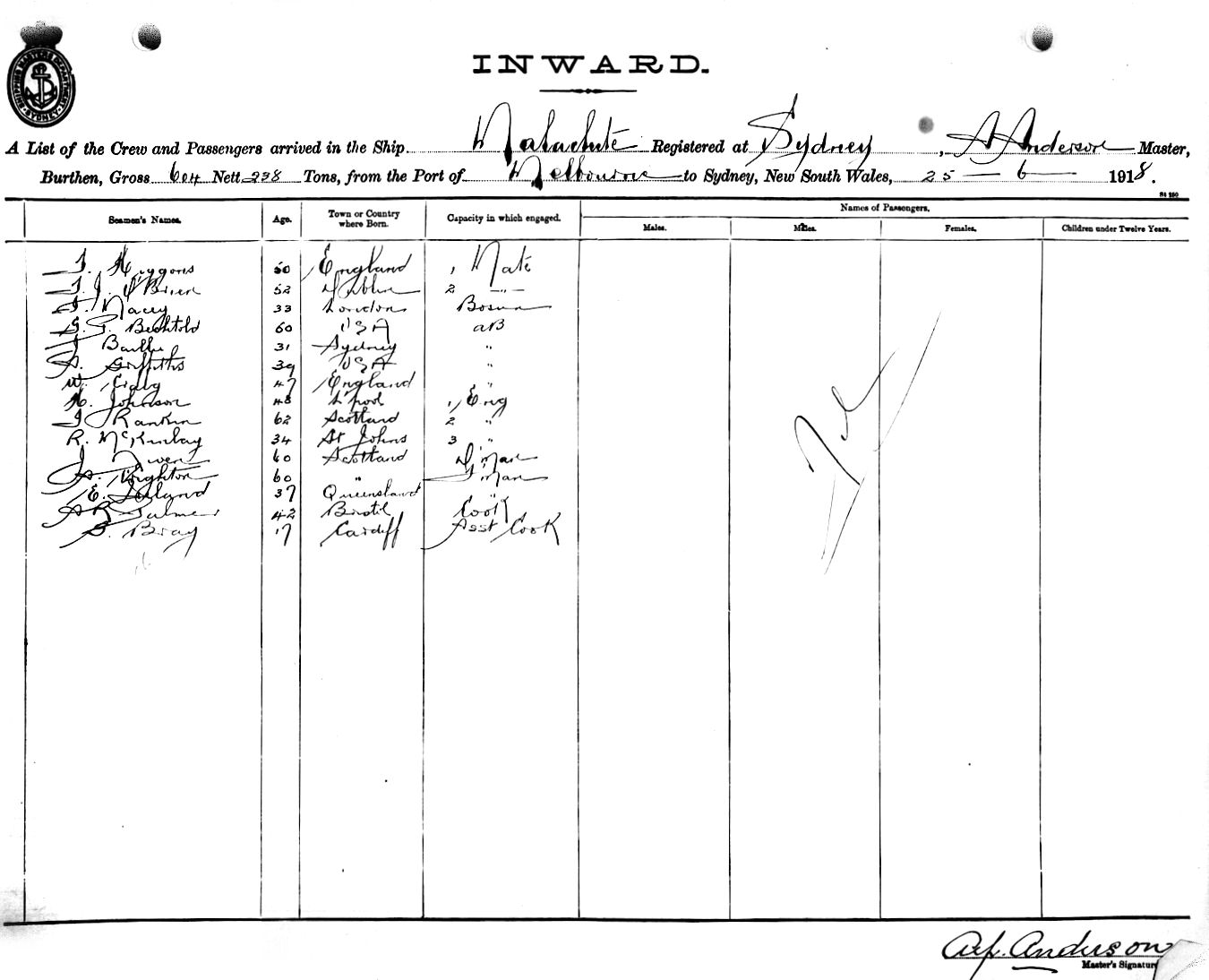 MALACHITEOF SYDNEY, A. ANDERSON, MASTER, BURTHEN 604/238 TONS FROM THE PORT OF MELBOURNE TO SYDNEY, NEW SOUTH WALES, 25TH JUNE 1918 |