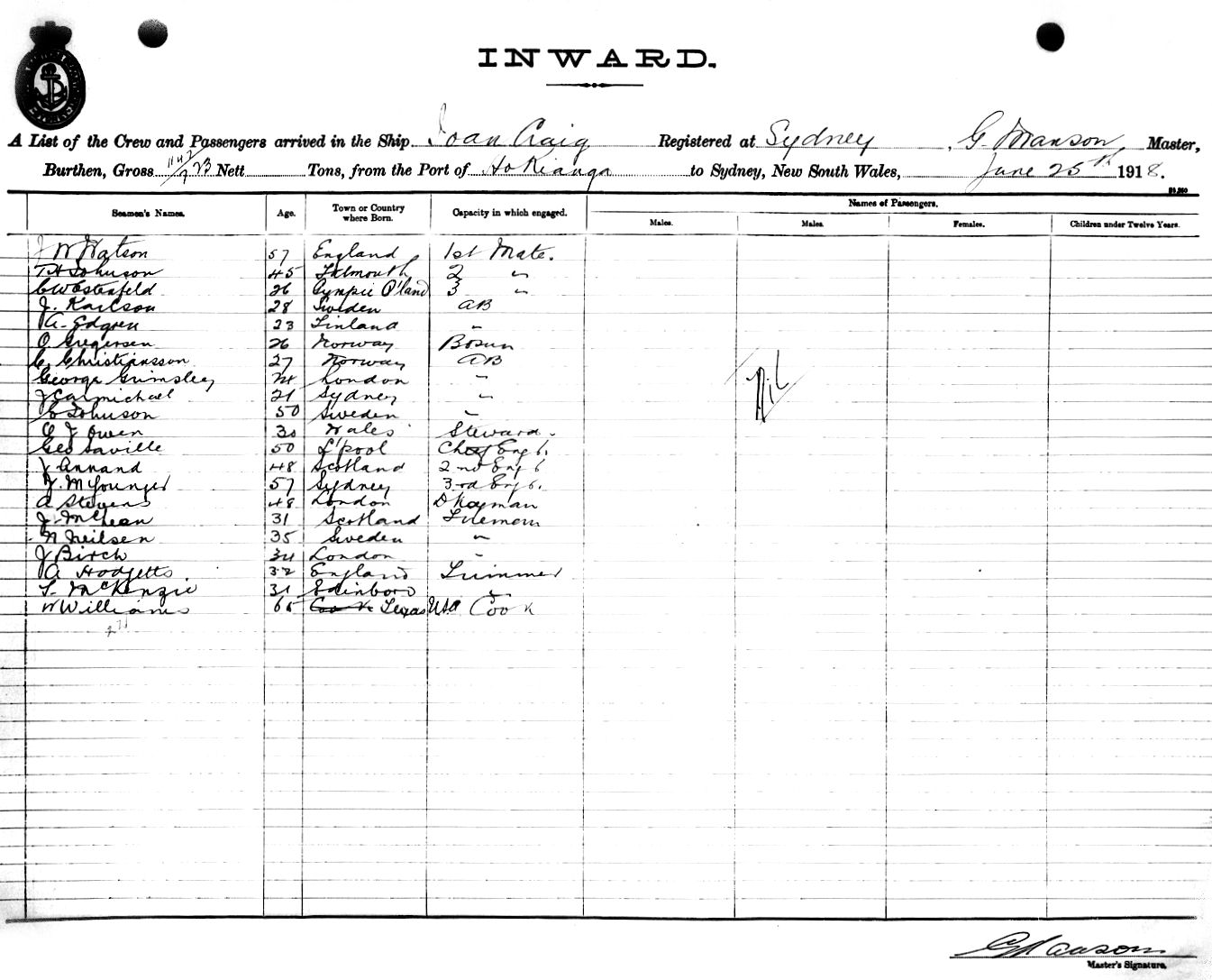 Mariners and ships in Australian Waters | JOAN CRAIGOF SYDNEY, G. MANSON, MASTER, BURTHEN 1147/723 TONS FROM THE PORT OF HOKIANGA, N.Z. TO SYDNEY, NEW SOUTH WALES, 25TH JUNE 1918 |