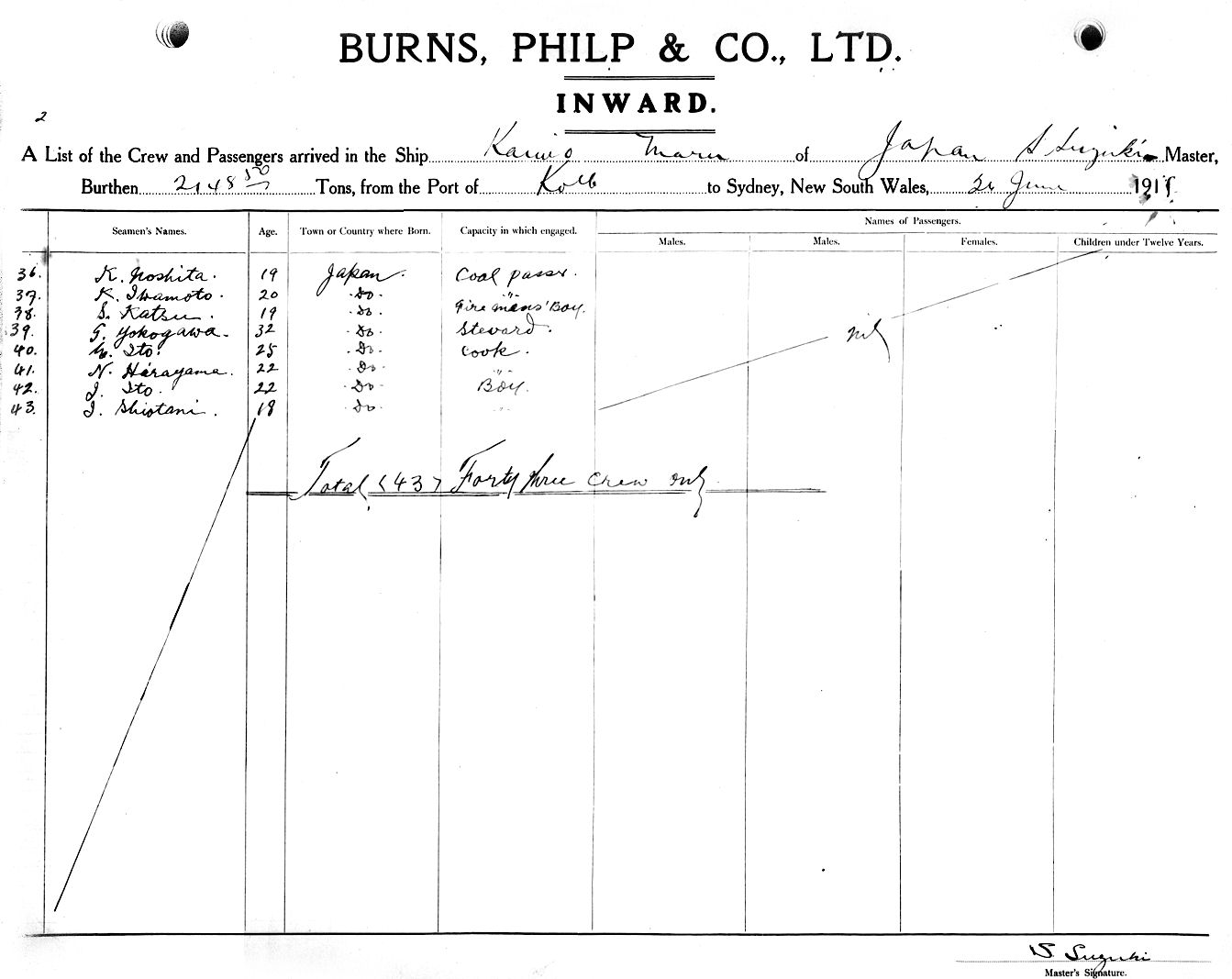 KAIWO MARUOF JAPAN, S. SUZUKI, MASTER, BURTHEN 2148.50 TONS FROM THE PORT OF KOBE, JAPAN TO SYDNEY, NEW SOUTH WALES, 26TH JUNE 1918 |