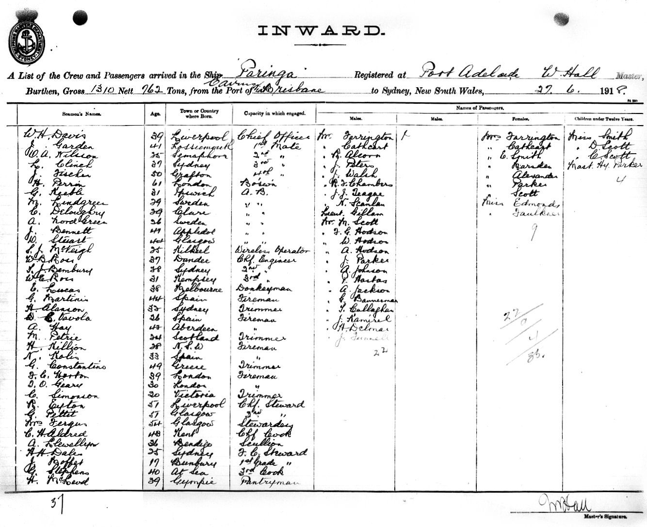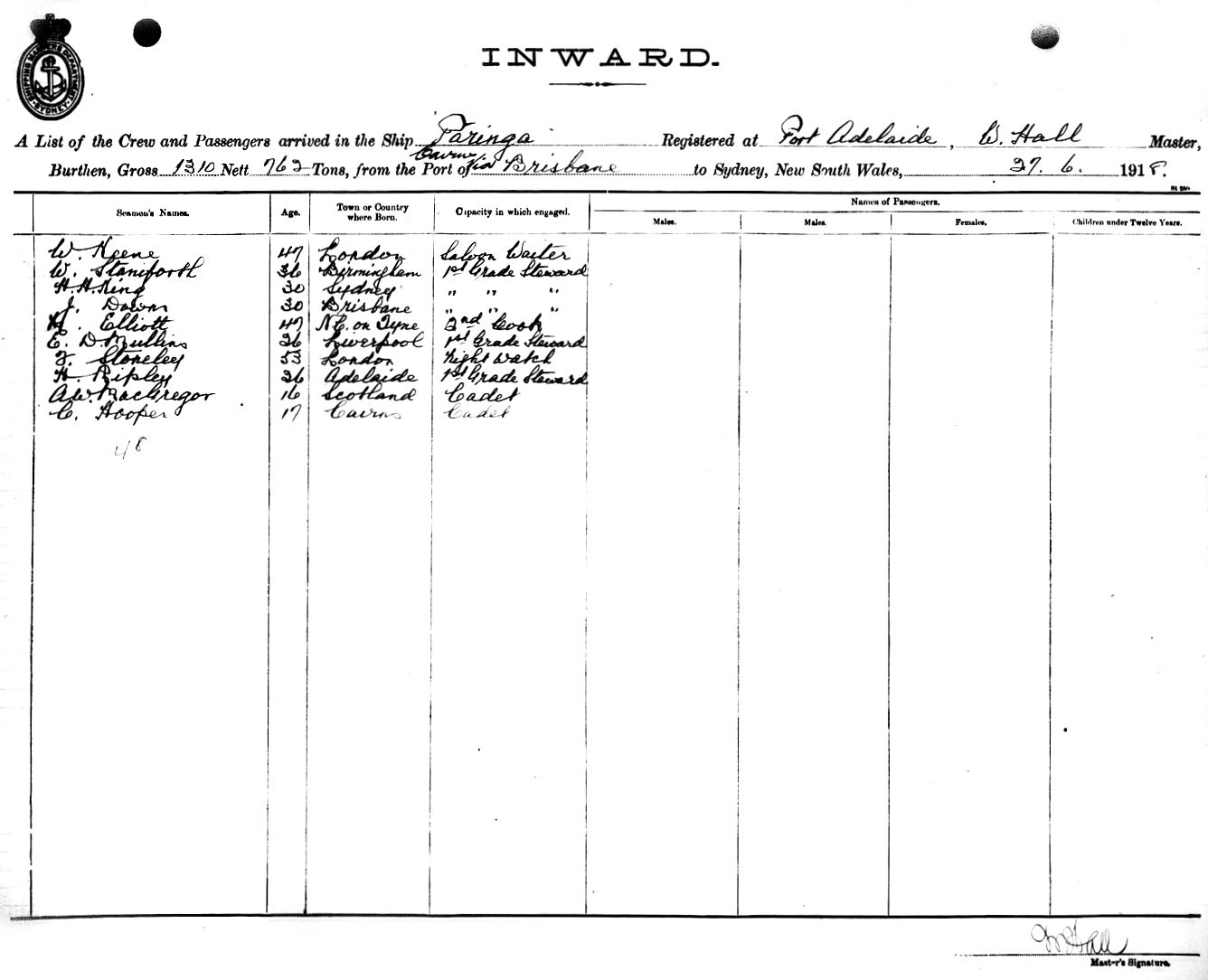 PARINGAOF PORT ADELAIDE, W. HALL, MASTER, BURTHEN 1310/762 TONS FROM THE PORT OF CAIRNS via BRISBANE TO SYDNEY, NEW SOUTH WALES, 27TH JUNE 1918 |
