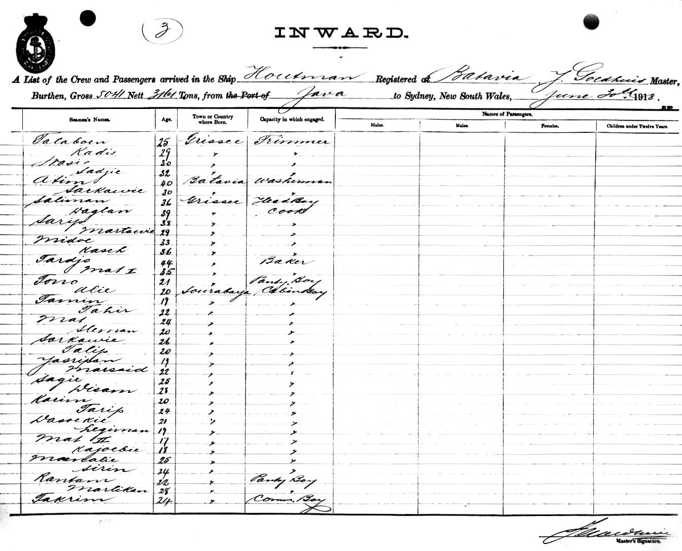 HOUTMANOF BATAVIA, J. GOEDHUIS, MASTER, BURTHEN 5041/3161 TONS FROM THE PORT OF JAVA via PORTS TO SYDNEY, NEW SOUTH WALES, 30TH JUNE 1918 |