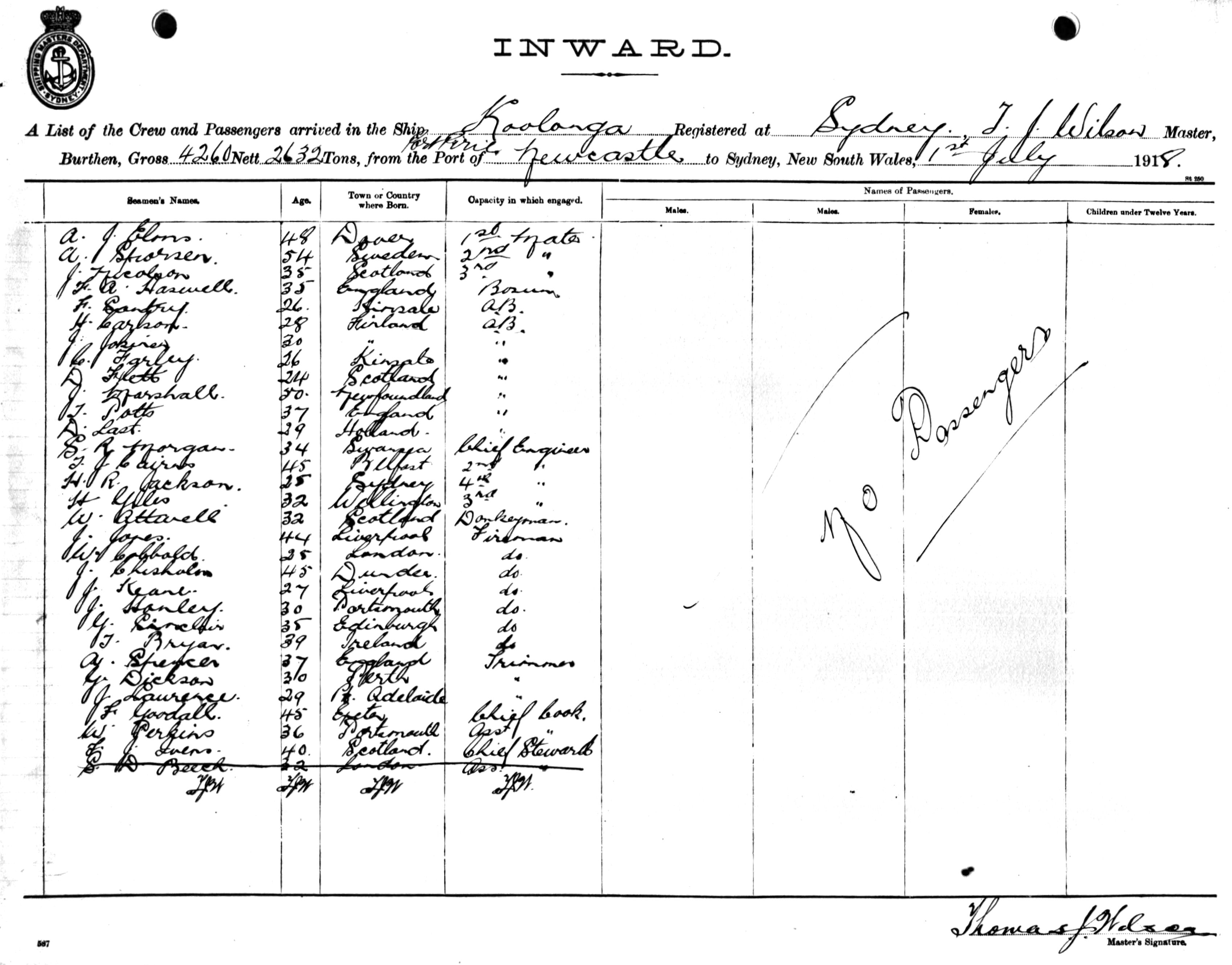 KOOLONGAOF SYDNEY, THOMAS J. WILSON, MASTER, BURTHEN 4260/2632 TONS FROM THE PORT OF PORT PIRIE via NEWCASTLE TO SYDNEY, NEW SOUTH WALES, 1ST JULY 1918 |