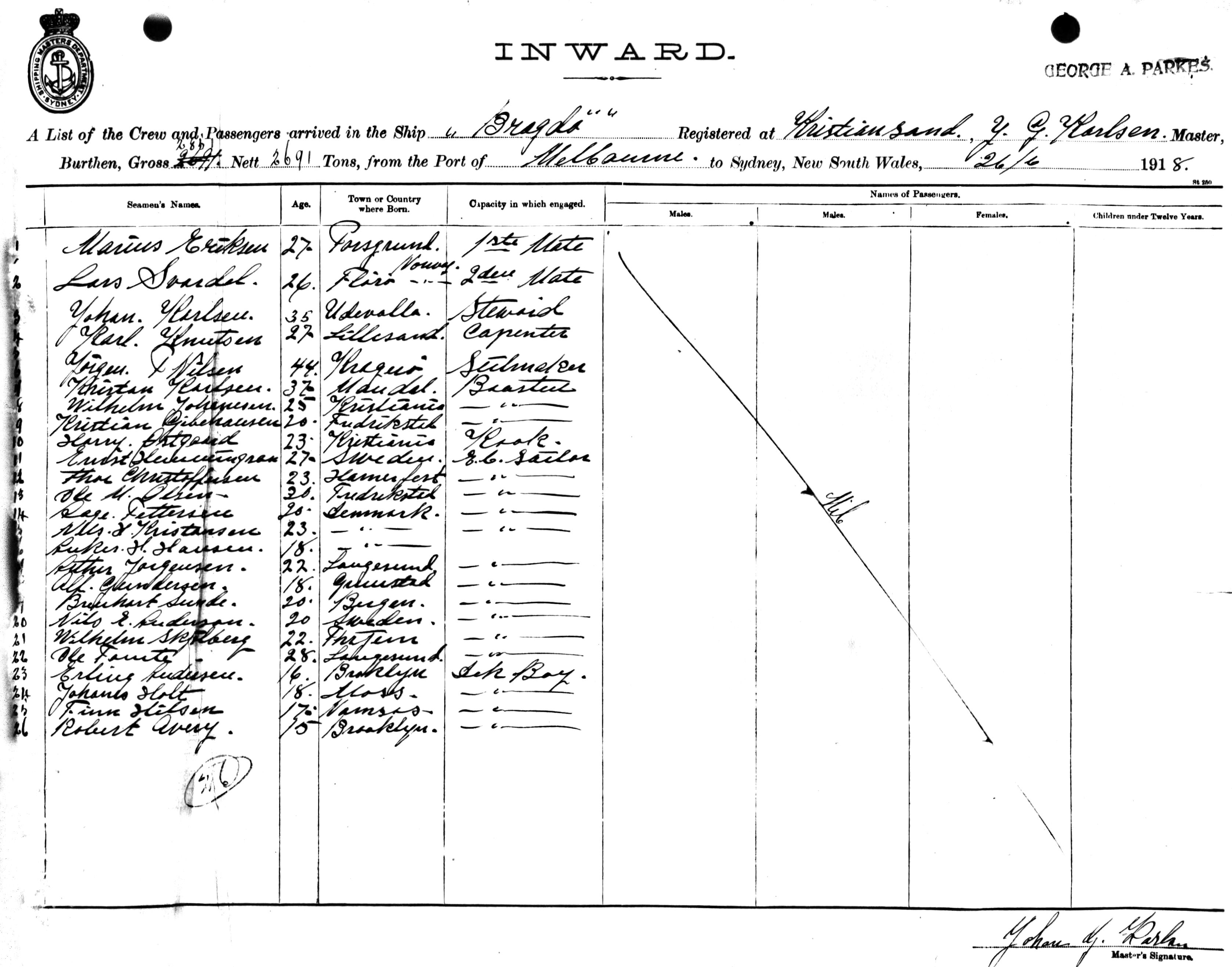 BRAGDOOF KRISTIANSAND, J. G. KARLSEN, MASTER, BURTHEN 2851/2691 TONS FROM THE PORT OF MELBOURNE TO SYDNEY, NEW SOUTH WALES, 26TH JUNE 1918 |