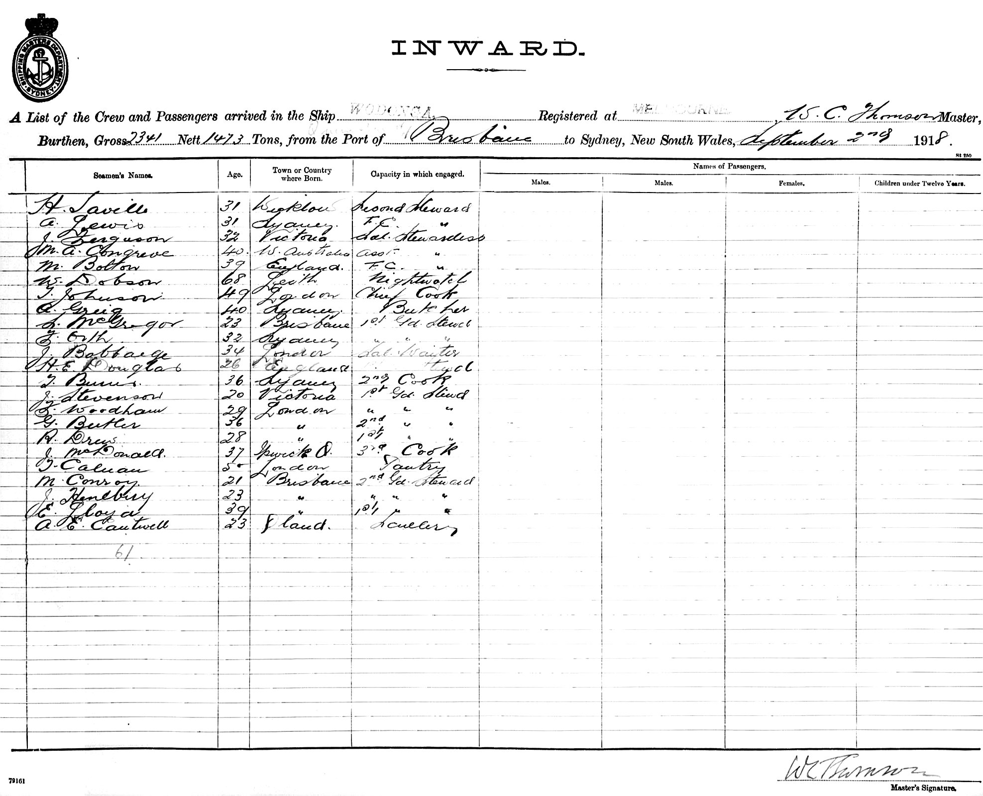 WODONGAOF MELBOURNE, W. C. THOMSON, MASTER, BURTHEN 2341/1473 TONS FROM QUEENSLAND PORTS via BRISBANE TO SYDNEY, NEW SOUTH WALES, 2ND SEPTEMBER 1918 |