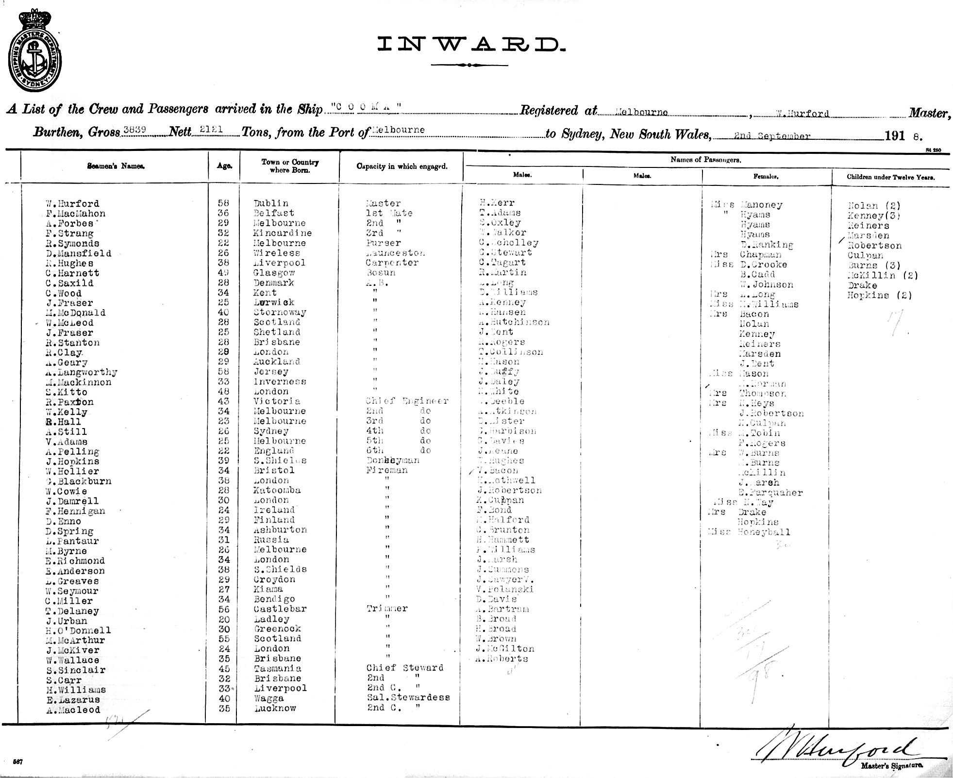 COOMAOF MELBOURNE, W. HURFORD, MASTER, BURTHEN 3839/2121 TONS FROM THE PORT OF MELBOURNE TO SYDNEY, NEW SOUTH WALES, 2ND SEPTEMBER 1918 |