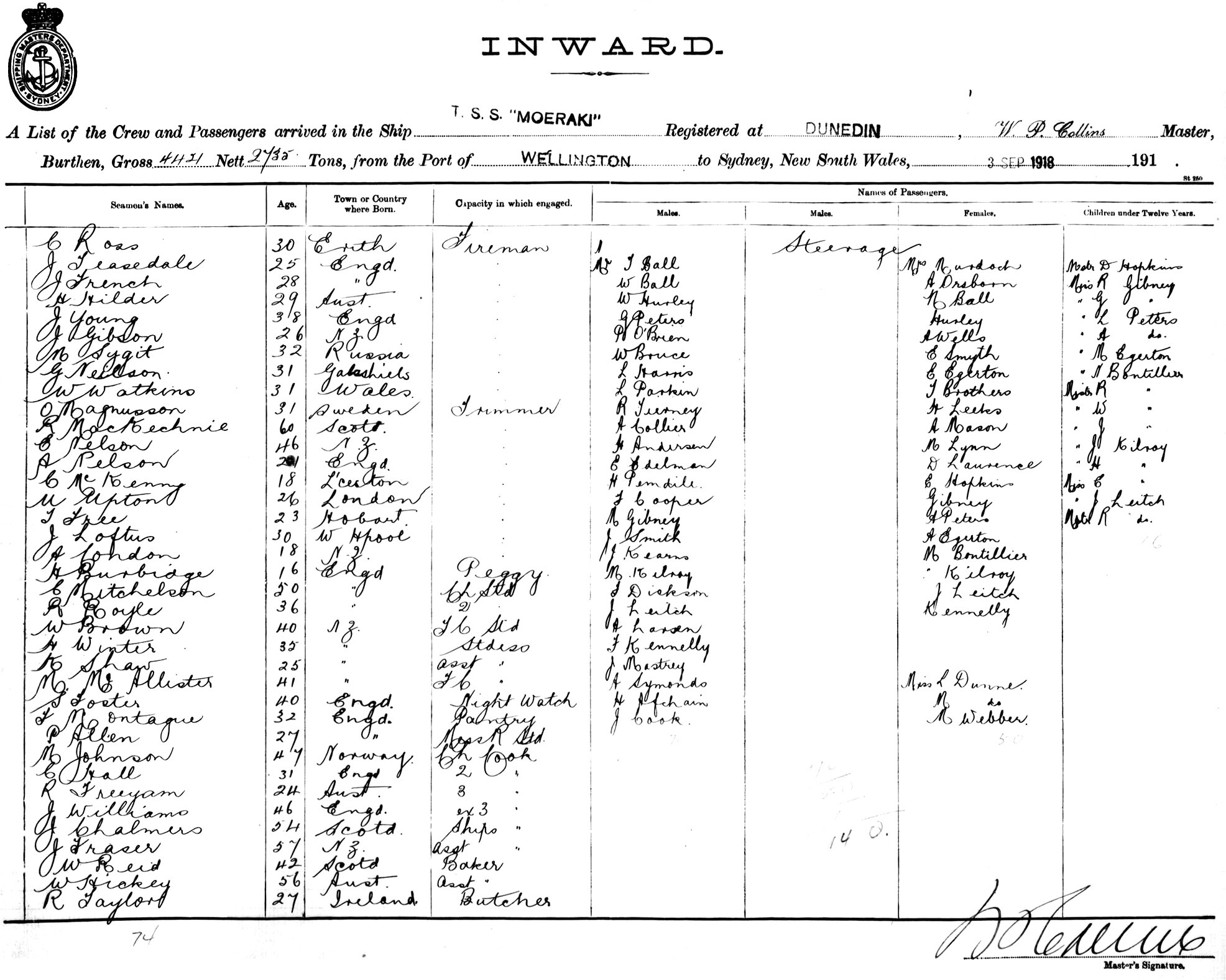 MOERAKIOF DUNEDIN, W. P. COLLINS, MASTER, BURTHEN 4421.2735 TONS FROM THE PORT OF WELLINGTON TO SYDNEY, NEW SOUTH WALES, 3RD SEPTEMBER 1918 |
