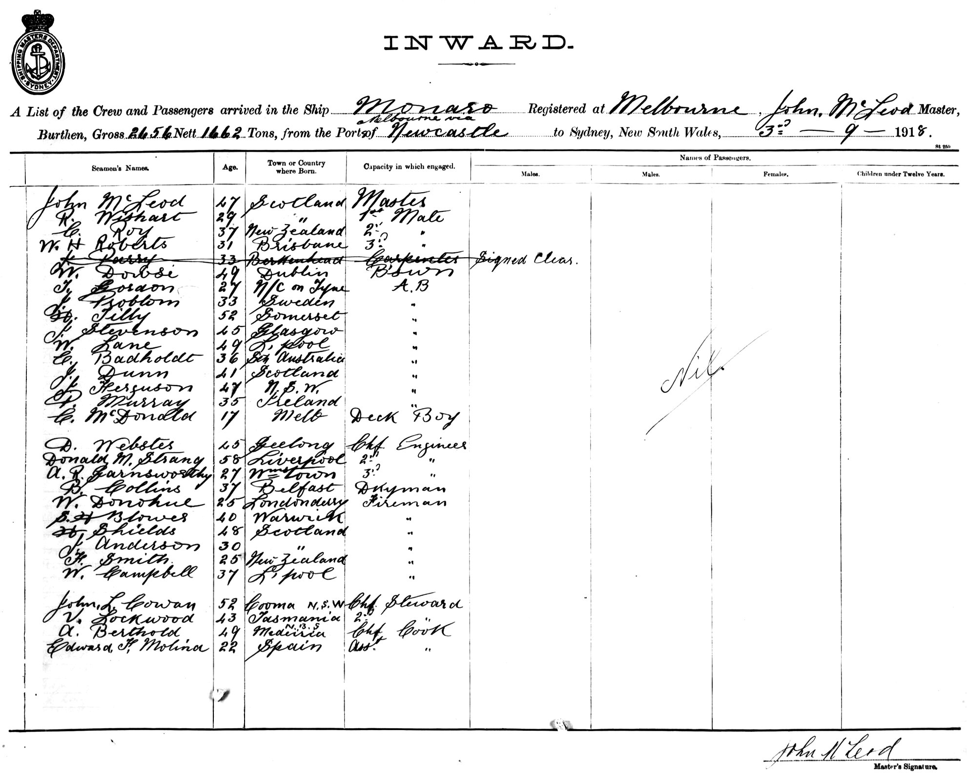 MONAROOF MELBOURNE, JOHN MCLEOD, MASTER, BURTHEN 2656/1662 TONS FROM THE PORT OF MELBOURNE via NEWCASTLE TO SYDNEY, NEW SOUTH WALES, 3RD SEPTEMBER 1918 |