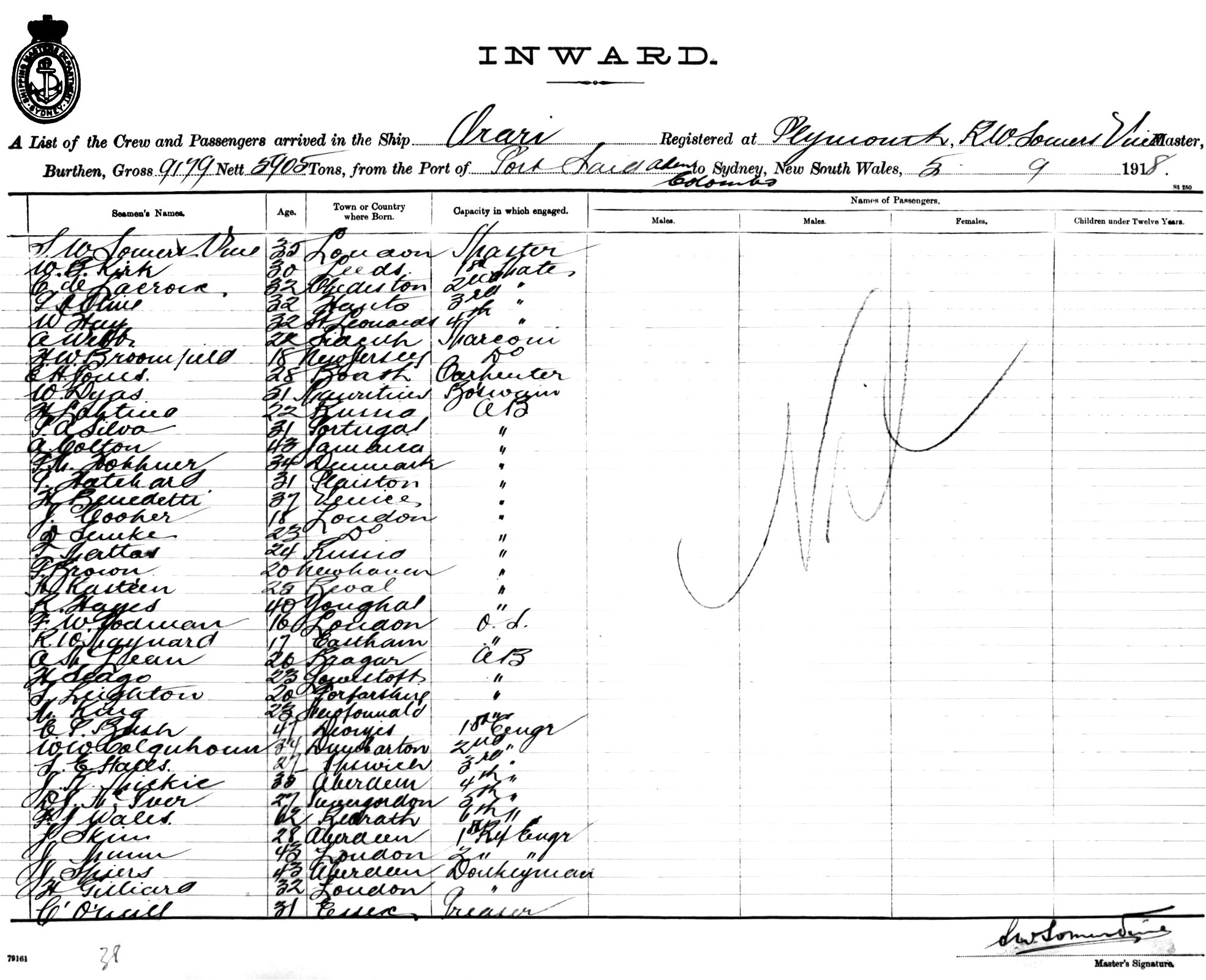 ORARIOF PLYMOUTH, S. W. SOMERS VINE, MASTER, BURTHEN 9179/5905 TONS FROM THE PORTS OF PORT SAID, ADEN & COLOMBO TO SYDNEY, NEW SOUTH WALES, 5TH SEPTEMBER 1918 |