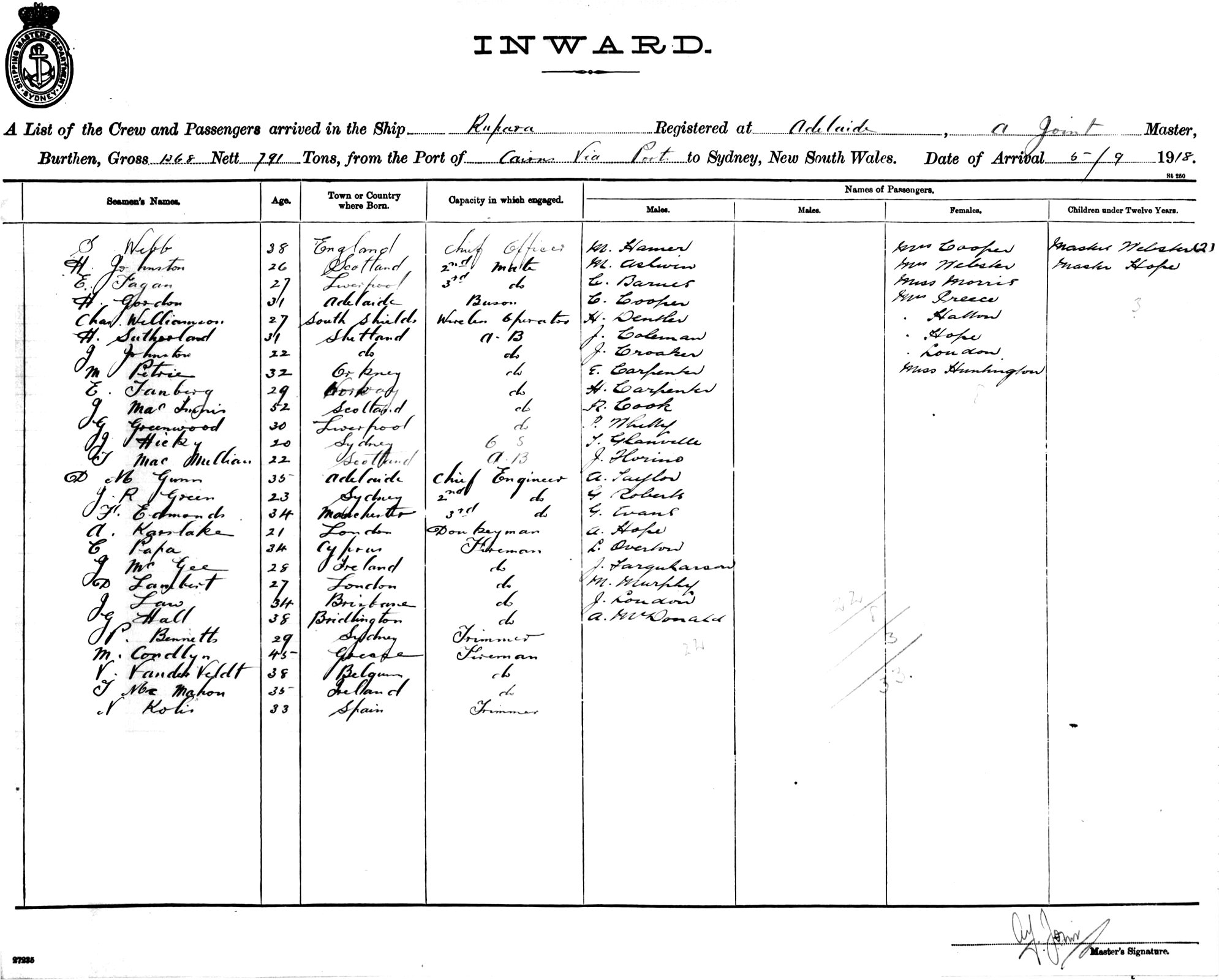 Mariners and ships in Australian Waters | RUPARAOF SYDNEY, A. JOINT, MASTER, BURTHEN 1268/791 TONS FROM THE PORT OF CAIRNS via PORTS TO SYDNEY, NEW SOUTH WALES, 5TH SEPTEMBER 1918 |
