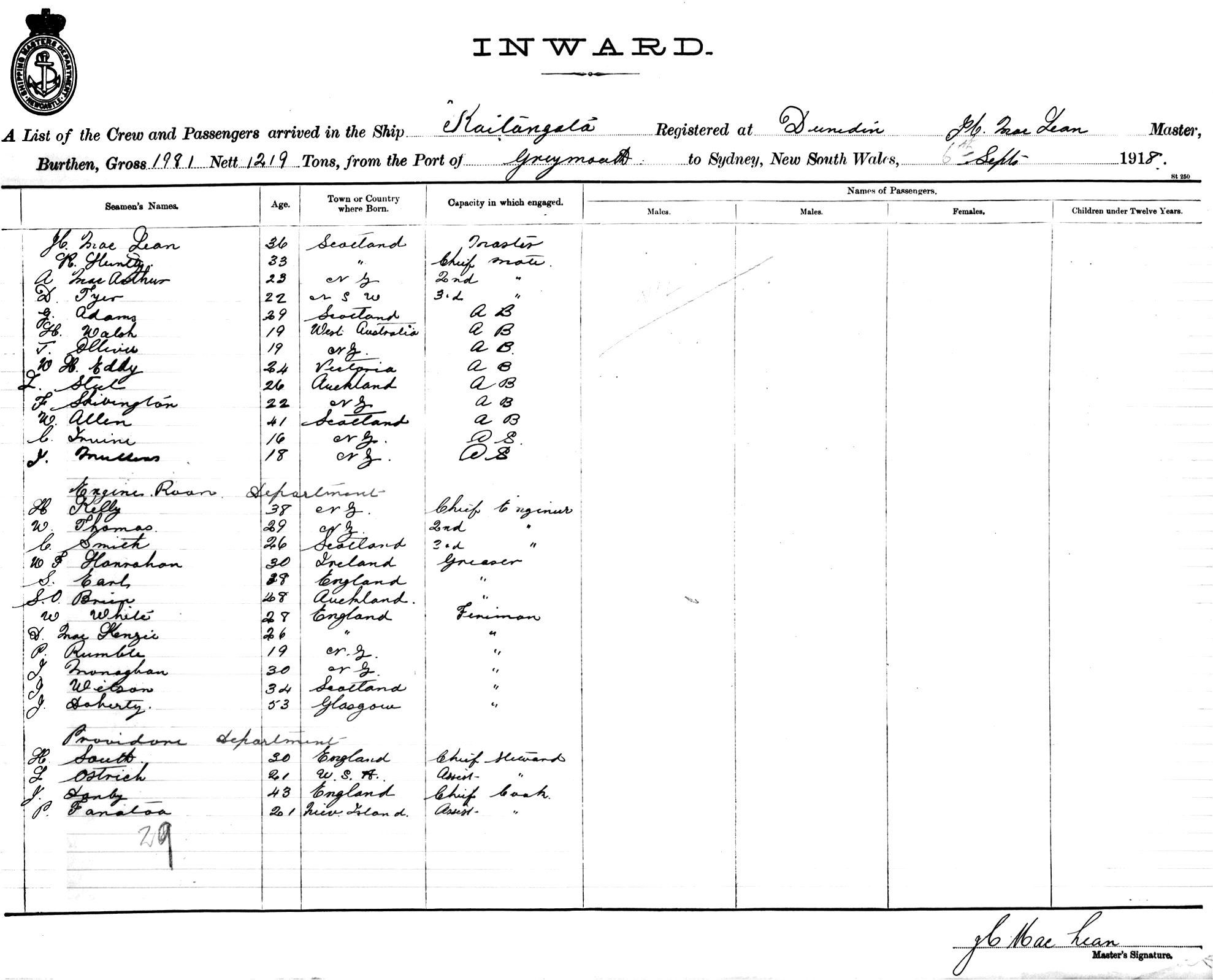 KAITANGATAOF DUNEDIN, J. C. MACLEAN, MASTER, BURTHEN 1981/1219 TONS FROM THE PORT OF GREYMOUTH, N.Z. TO SYDNEY, NEW SOUTH WALES, 6TH SEPTEMBER 1918 |