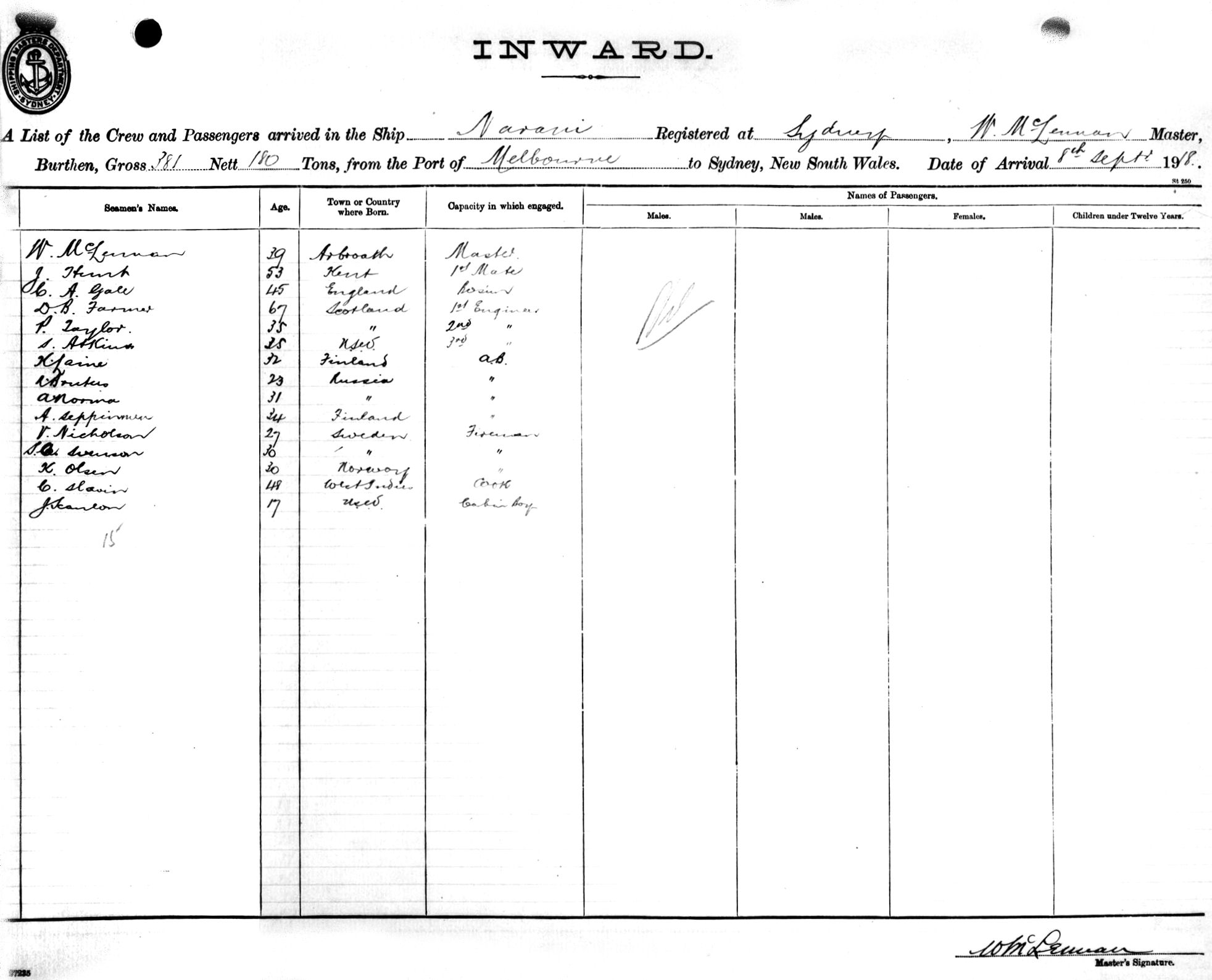NARANIOF SYDNEY, W. MCLENNAN, MASTER, BURTHEN 381/180 TONS FROM THE PORT OF MELBOURNE TO SYDNEY, NEW SOUTH WALES, 8TH SEPTEMBER 1918 |