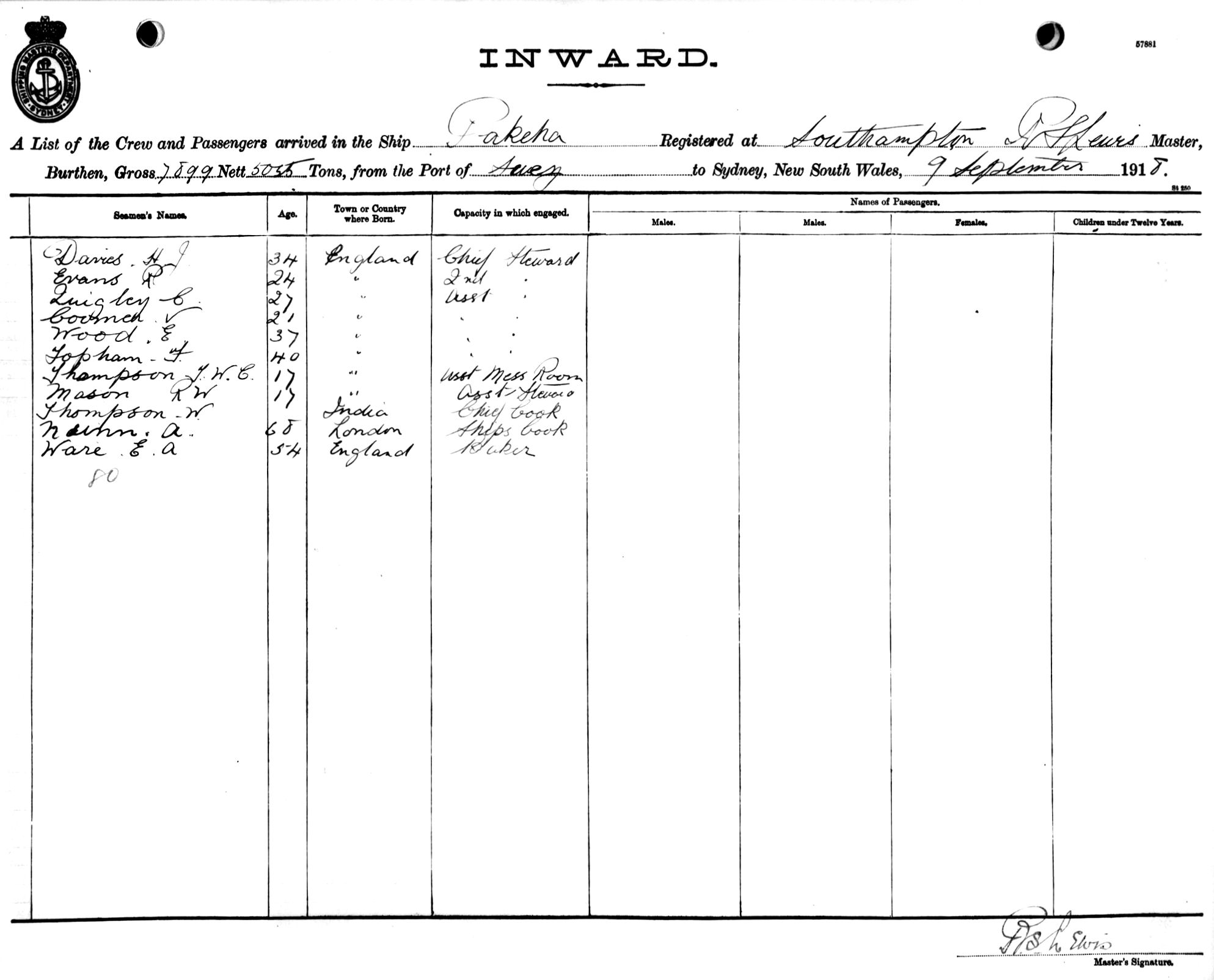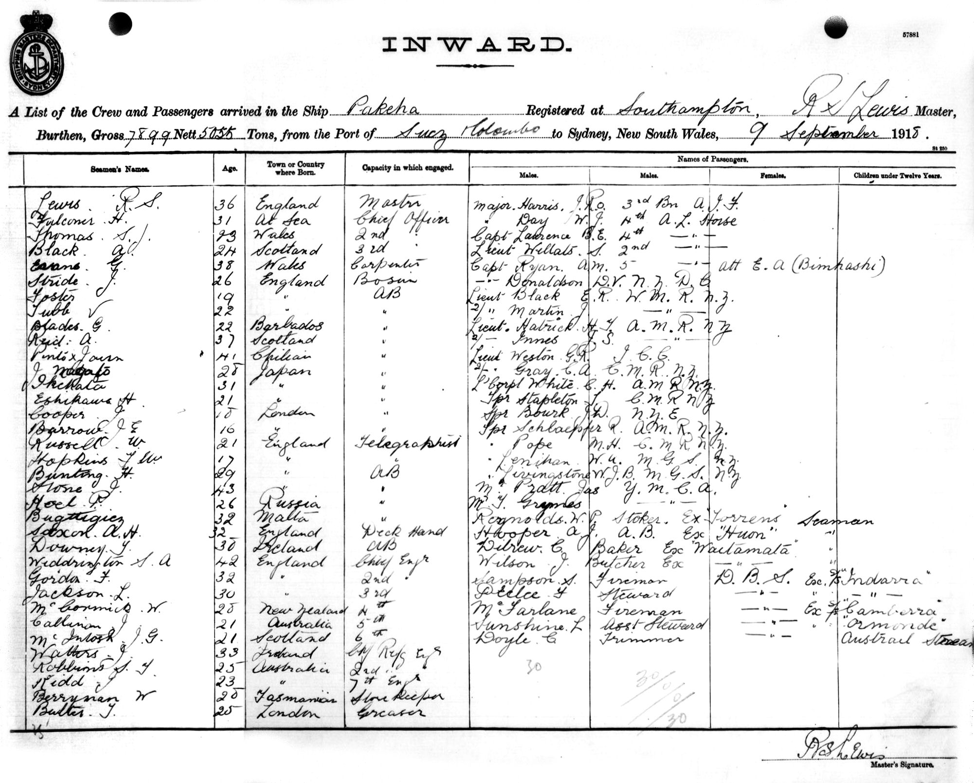 PAKEHAOF SOUTHAMPTON, R. S. LEWIS, MASTER, BURTHEN 7899/5055 TONS FROM THE PORTS OF SUEZ & COLOMBO TO SYDNEY, NEW SOUTH WALES, 9TH SEPTEMBER 1918 |