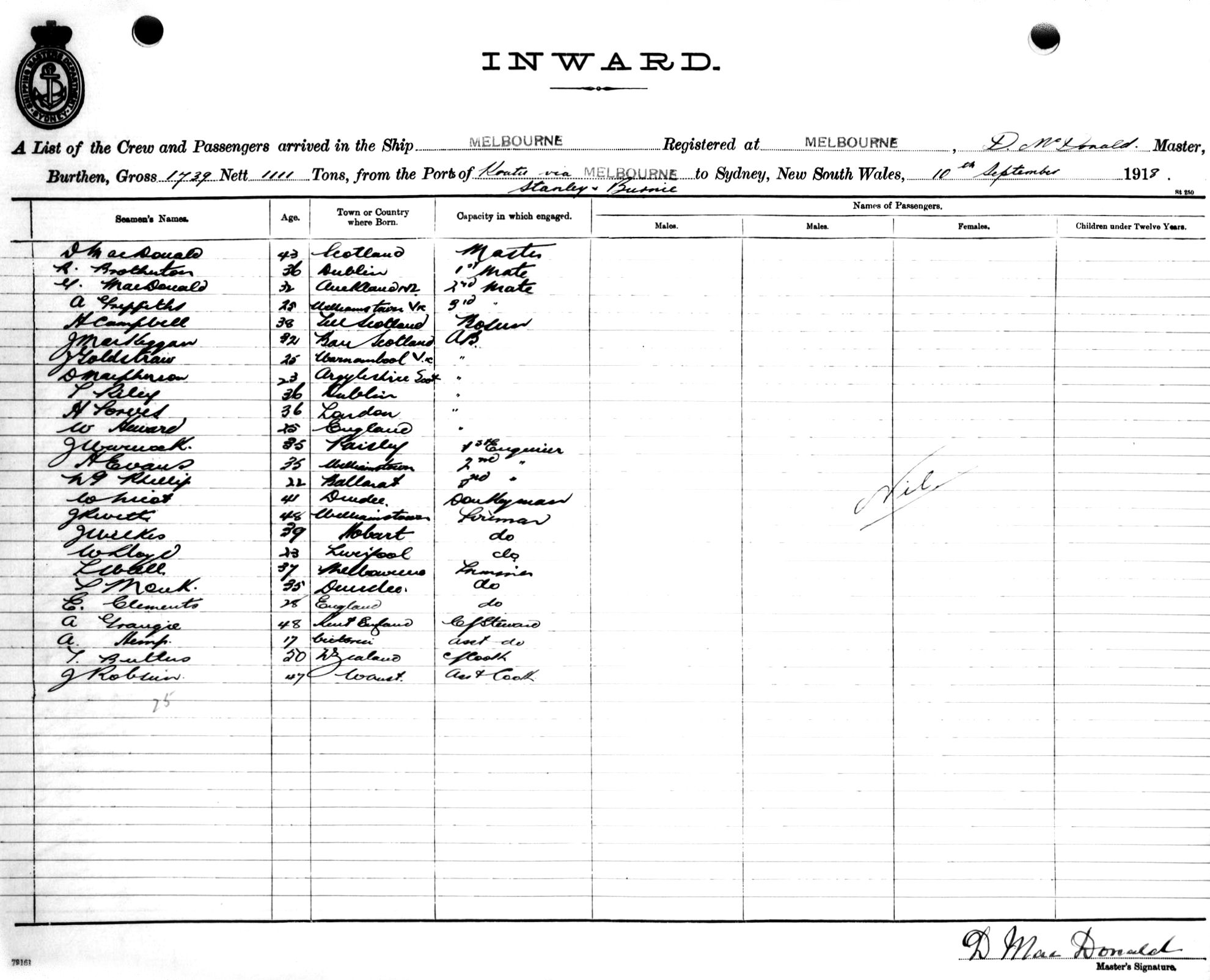 MELBOURNEOF MELBOURNE, D. MCDONALD, MASTER, BURTHEN 1739/1111 TONS FROM THE PORT OF KOATU (?) VIA MELBOURNE, STANLEY & BURNIE TO SYDNEY, NEW SOUTH WALES, 10 SEPTEMBER, 1918 |